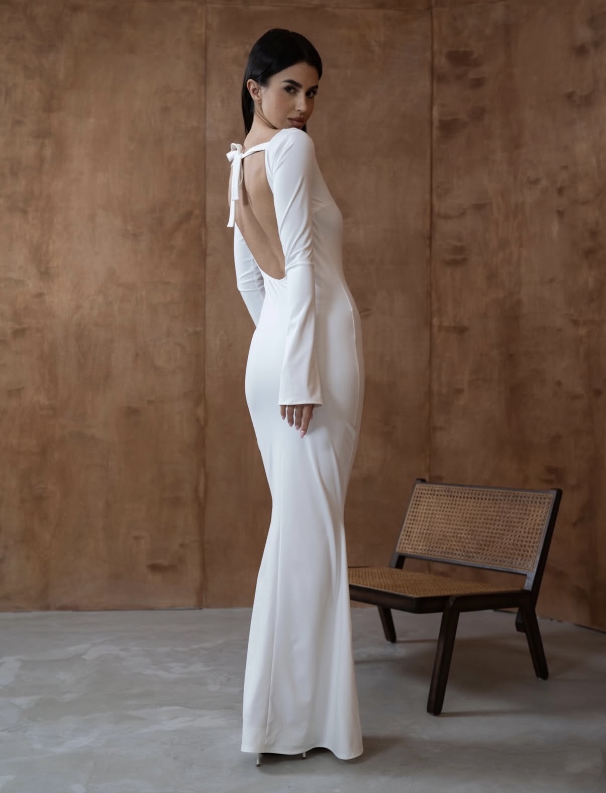 Das größte Plus des Modells ist der auffallend offene Rücken mit dekorativer Bindung, der dem Kleid einen einzigartigen Charakter und subtile Sinnlichkeit verleiht. Lange Ärmel und der glatte, dehnbare Stoff sorgen dafür, dass sich das Kleid perfekt an den Körper anpasst und einen hohen Tragekomfort bietet.