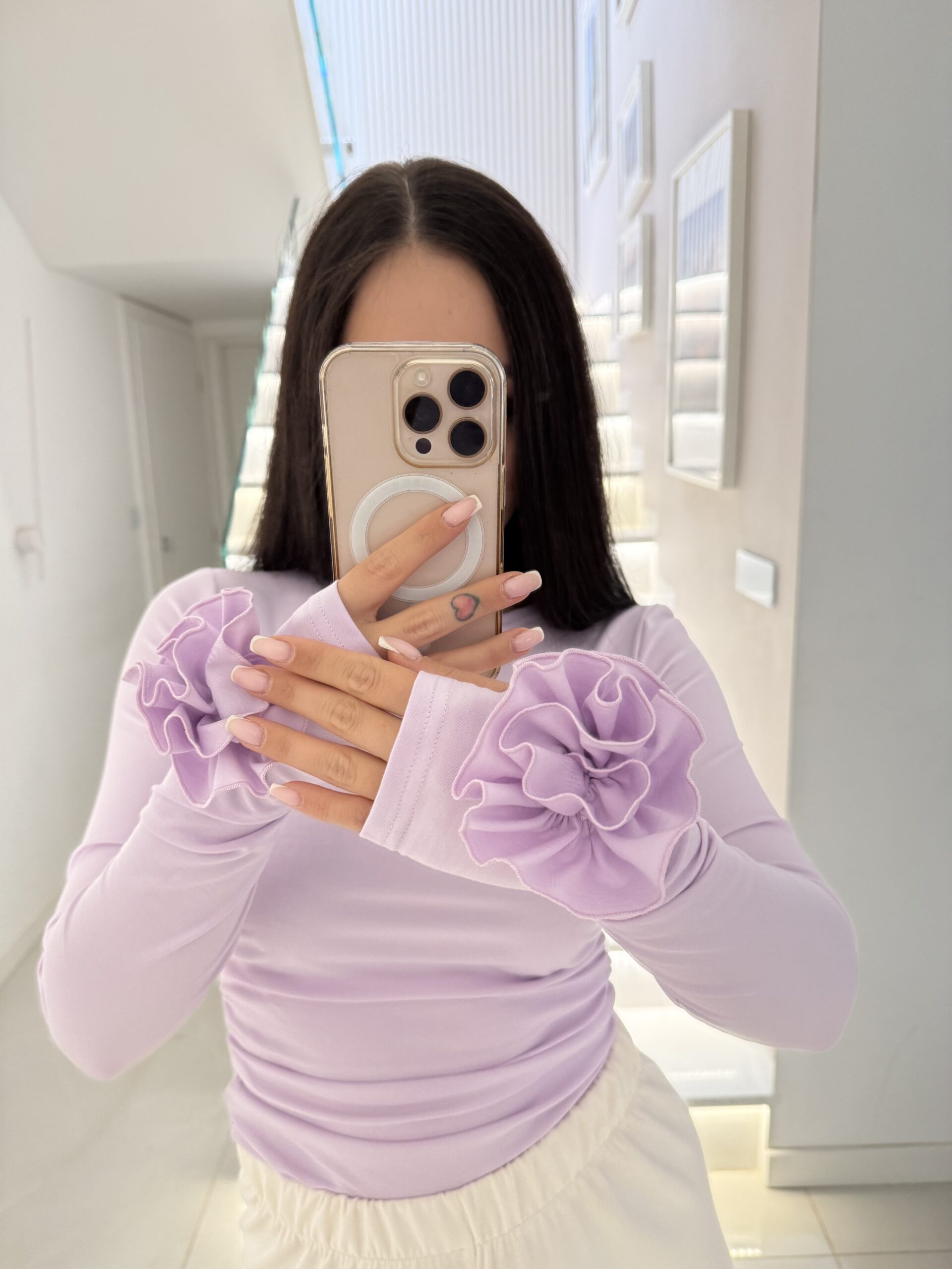 Eine atemberaubende lilafarbene Bluse, die durch ihre subtilen, romantischen Details ins Auge fällt. Der taillierte Schnitt betont schön die Silhouette und die auffälligen Rüschen an den Manschetten sorgen für mädchenhaften Charme und Eleganz. Der weiche, dehnbare Stoff sorgt für ganztägigen Komfort.