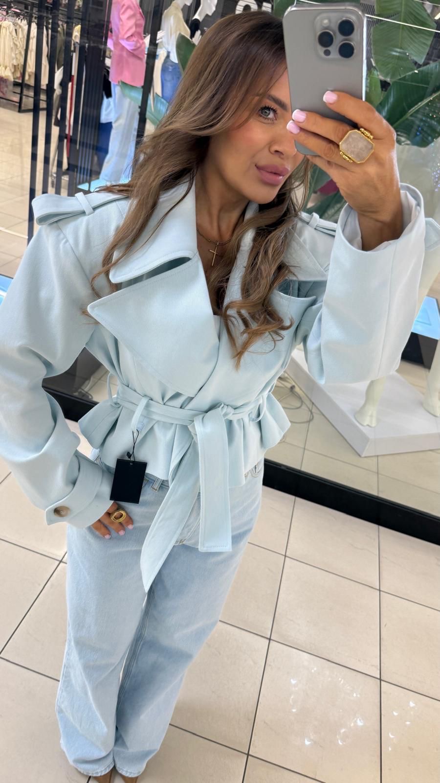 Ein stilvoller Trenchcoat in einem dezenten Blauton, der jeden Look wunderbar aufwertet. Das Modell mit Bindeband in der Taille betont die Silhouette, während der markante Kragen und die sorgfältigen Details ihm einen eleganten, modernen Touch verleihen.