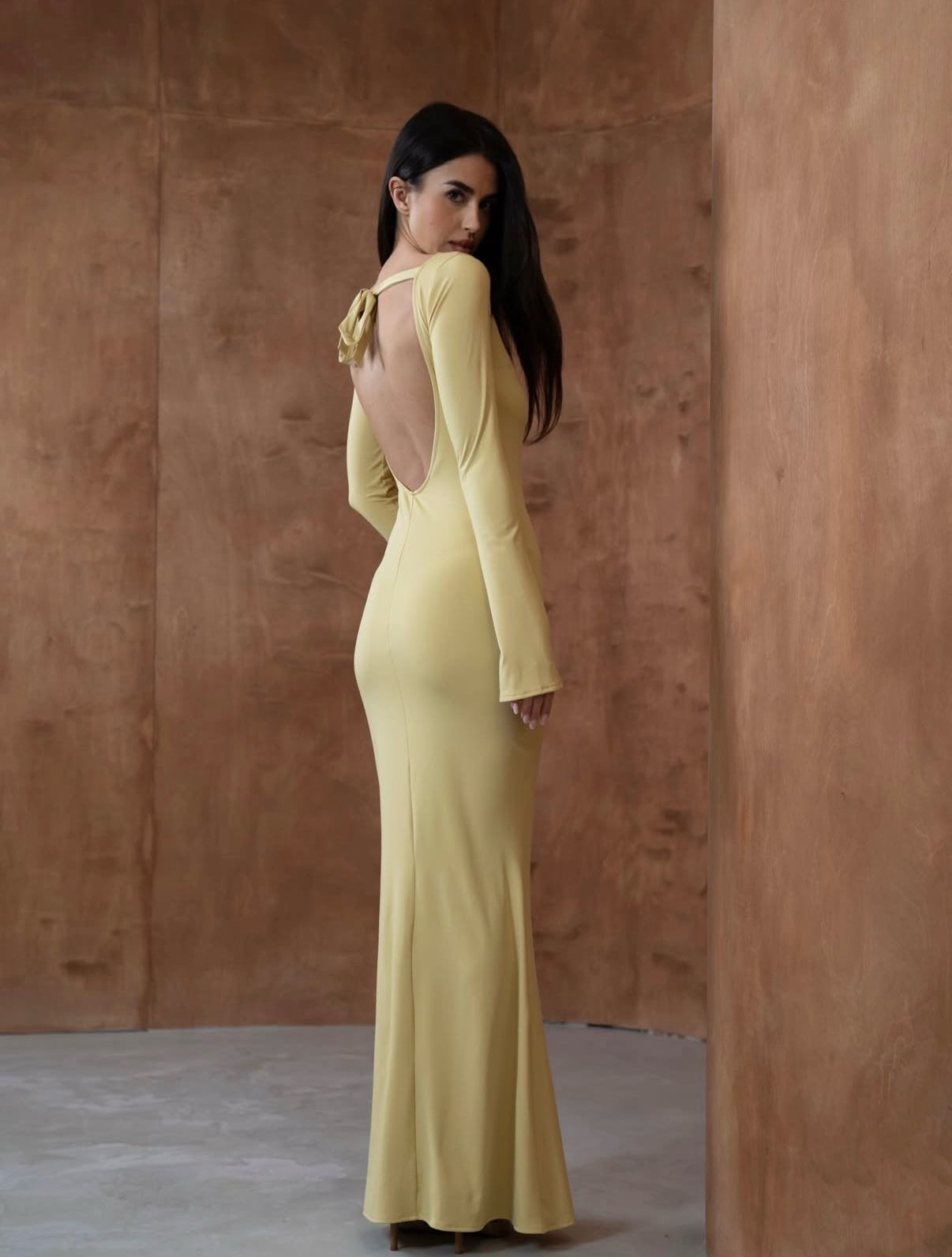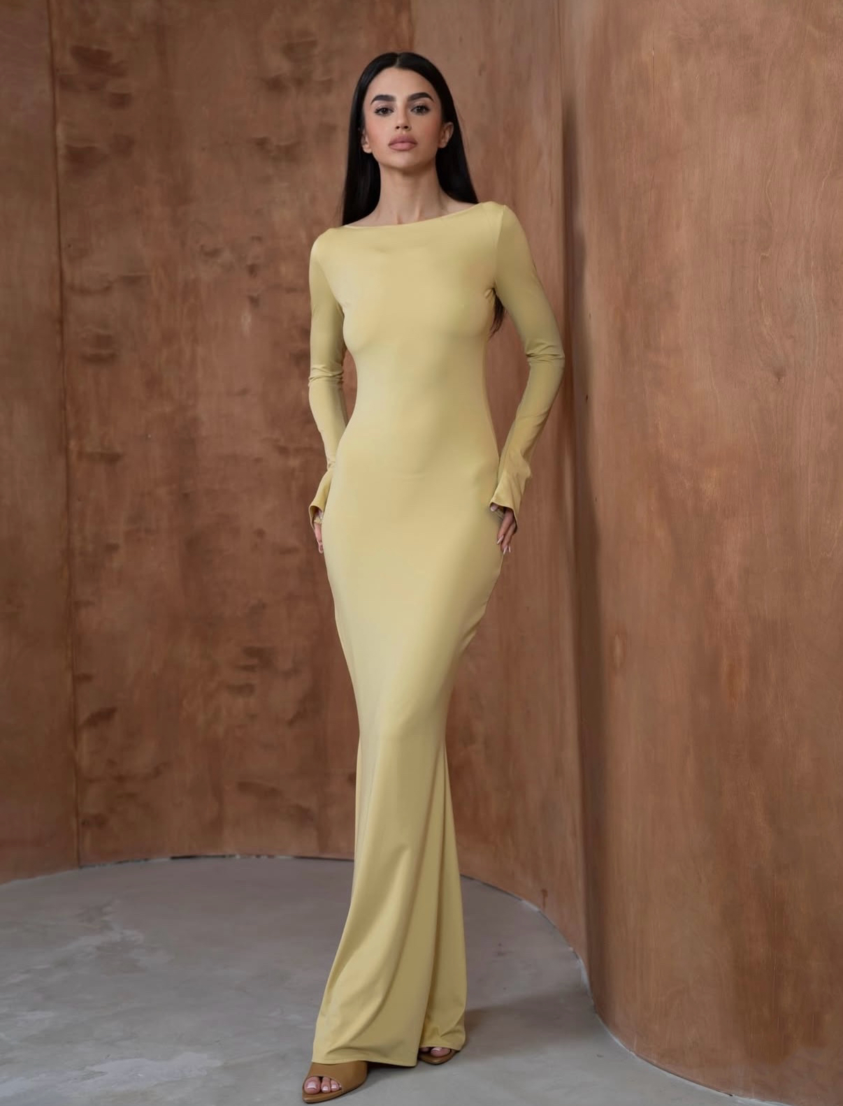 Elegantes und äußerst feminines Maxikleid in einem zarten Pastellgelb. Der taillierte Schnitt betont wunderschön die Silhouette, während der effektvoll ausgestellte Rücken mit einem zarten Band für Leichtigkeit und Sinnlichkeit sorgt. Lange Ärmel gleichen den minimalistischen Schnitt aus und lassen das Kleid äußerst stilvoll und zeitlos wirken.