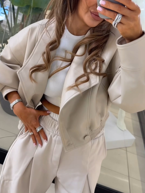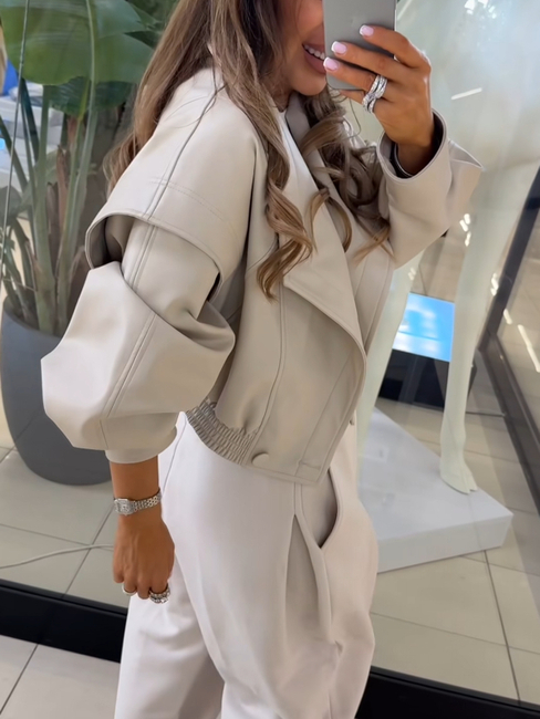 Es ist aus hochwertigem Öko-Leder mit einem weichen, zarten Finish gefertigt und liegt wunderbar am Körper an. Die Puffärmel verleihen ihm einen modischen Touch, während der taillierte Saum mit Bügelfalte die Taille betont und eine feminine, proportionierte Silhouette schafft. Der hellbeige Farbton sorgt für einen frischen und luxuriösen ‘cleanen’ Look.