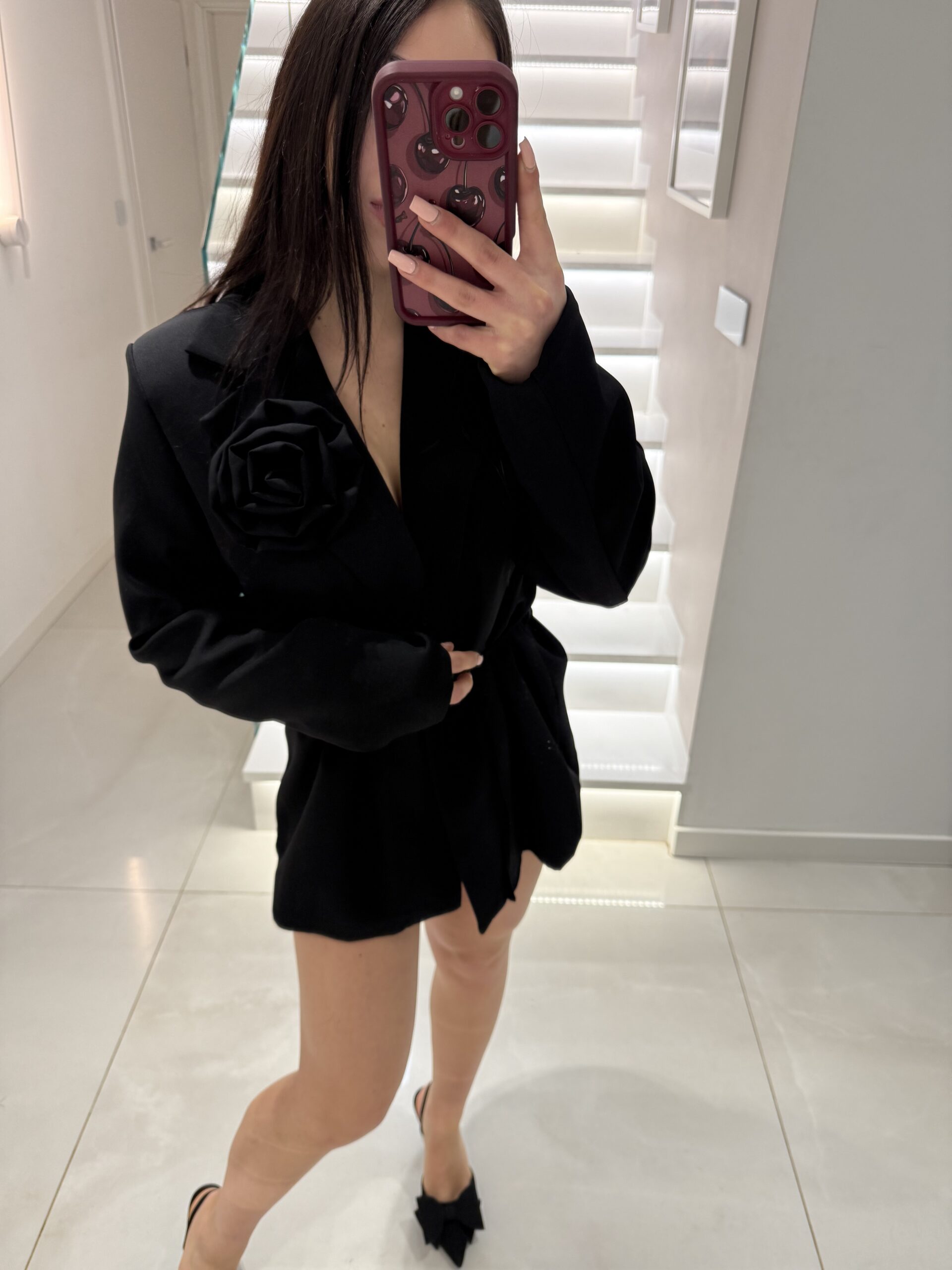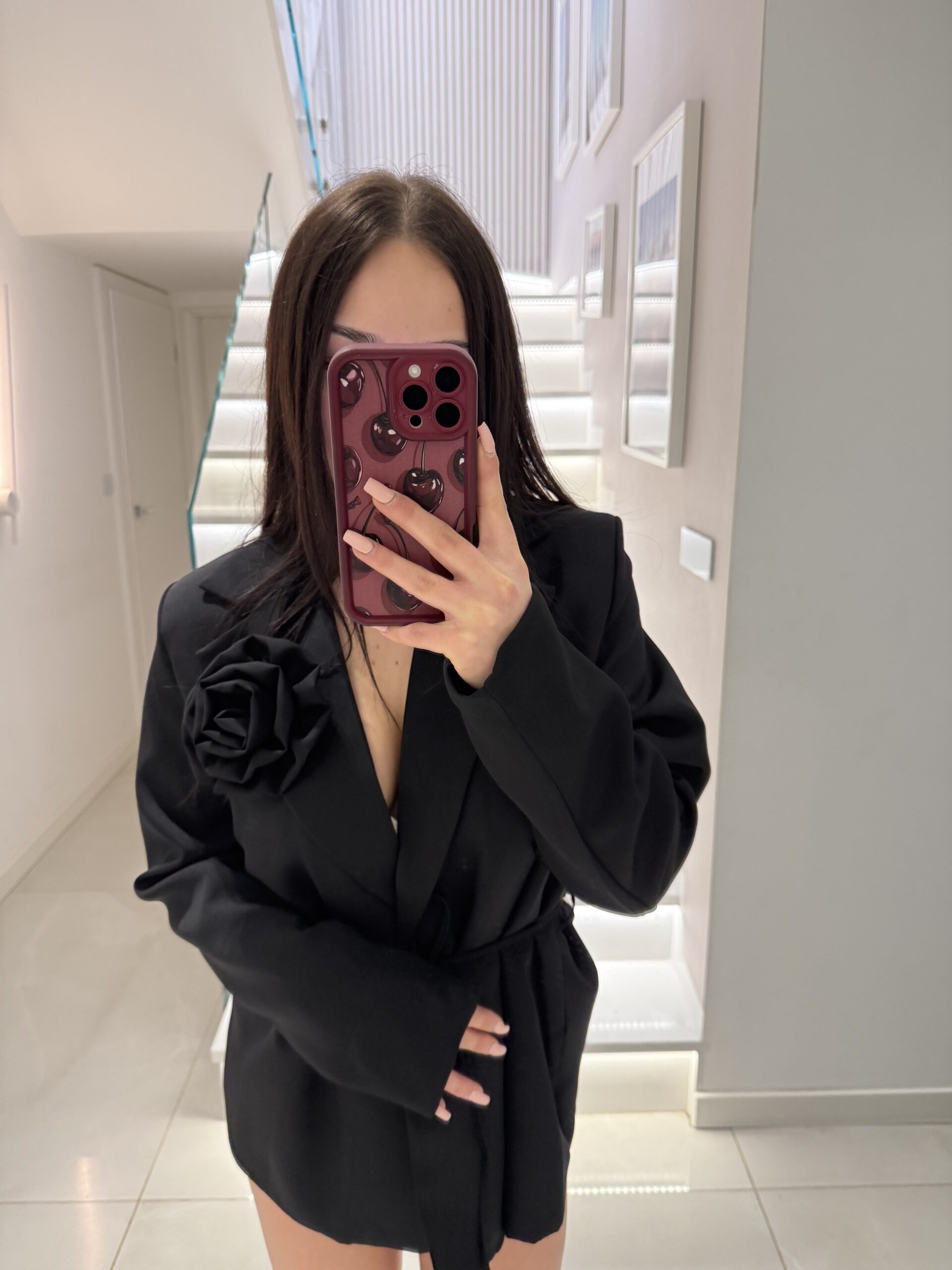 Der Blazer verfügt über eine abnehmbare schwarze Rose, die umgelegt oder ganz entfernt werden kann, um einen minimalistischen, klassischen Look zu kreieren. Es ist ein kleines, aber auffälliges Detail, das der Jacke einen einzigartigen Charakter und feminine Raffinesse verleiht.