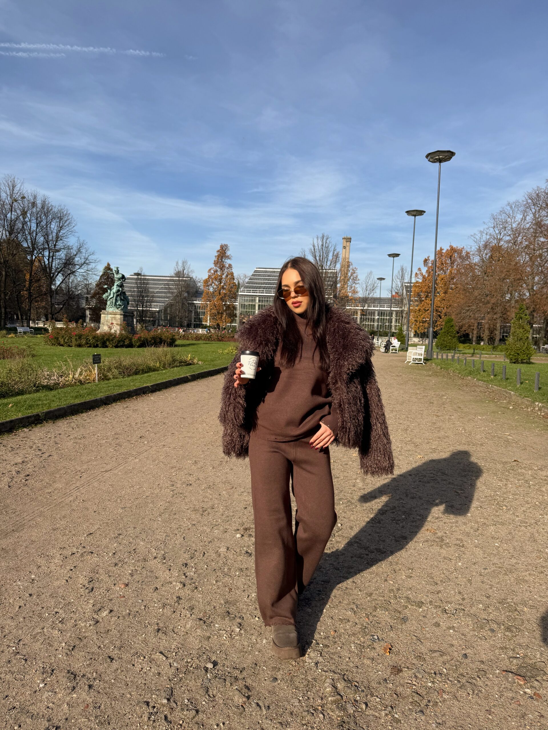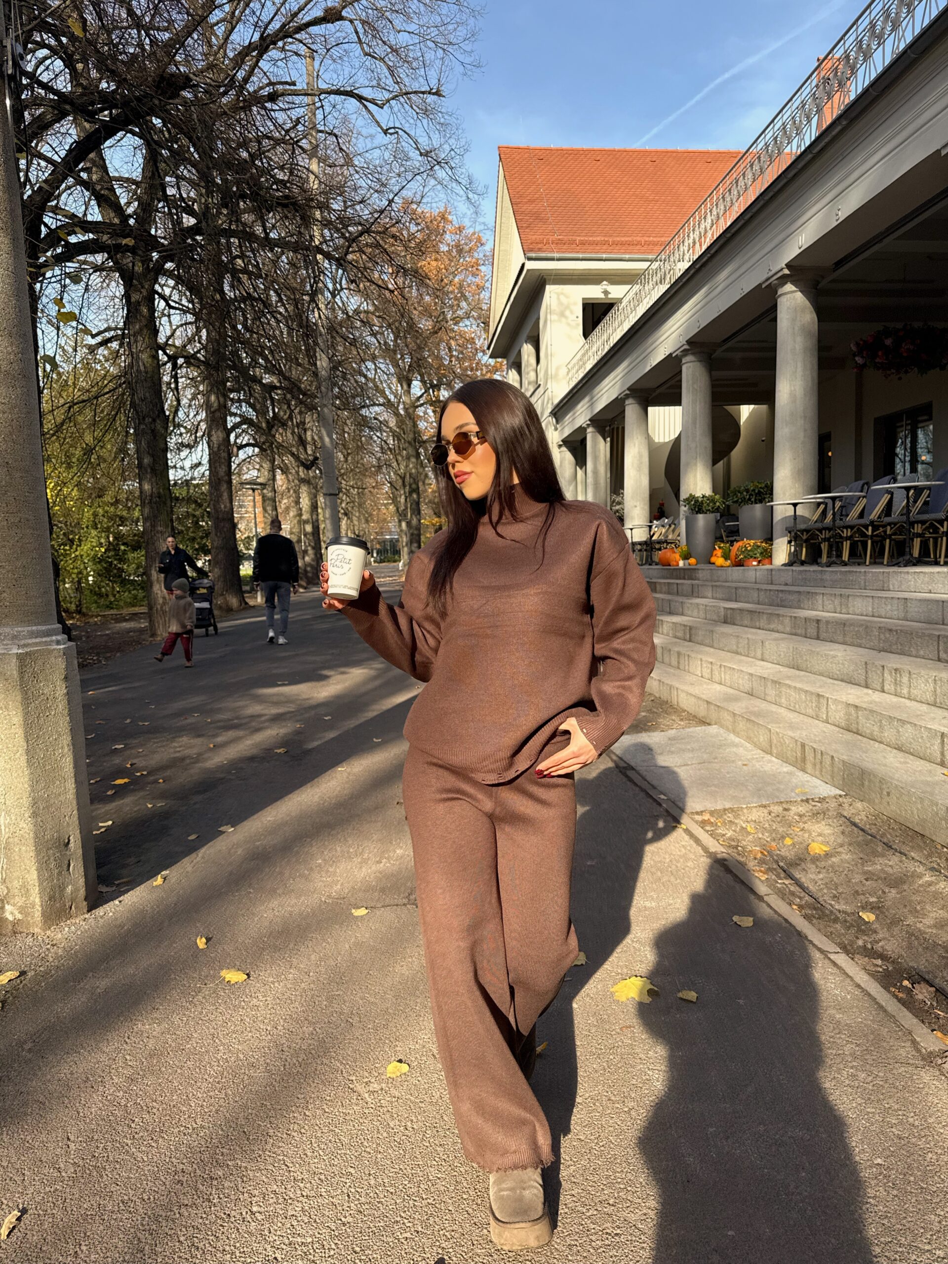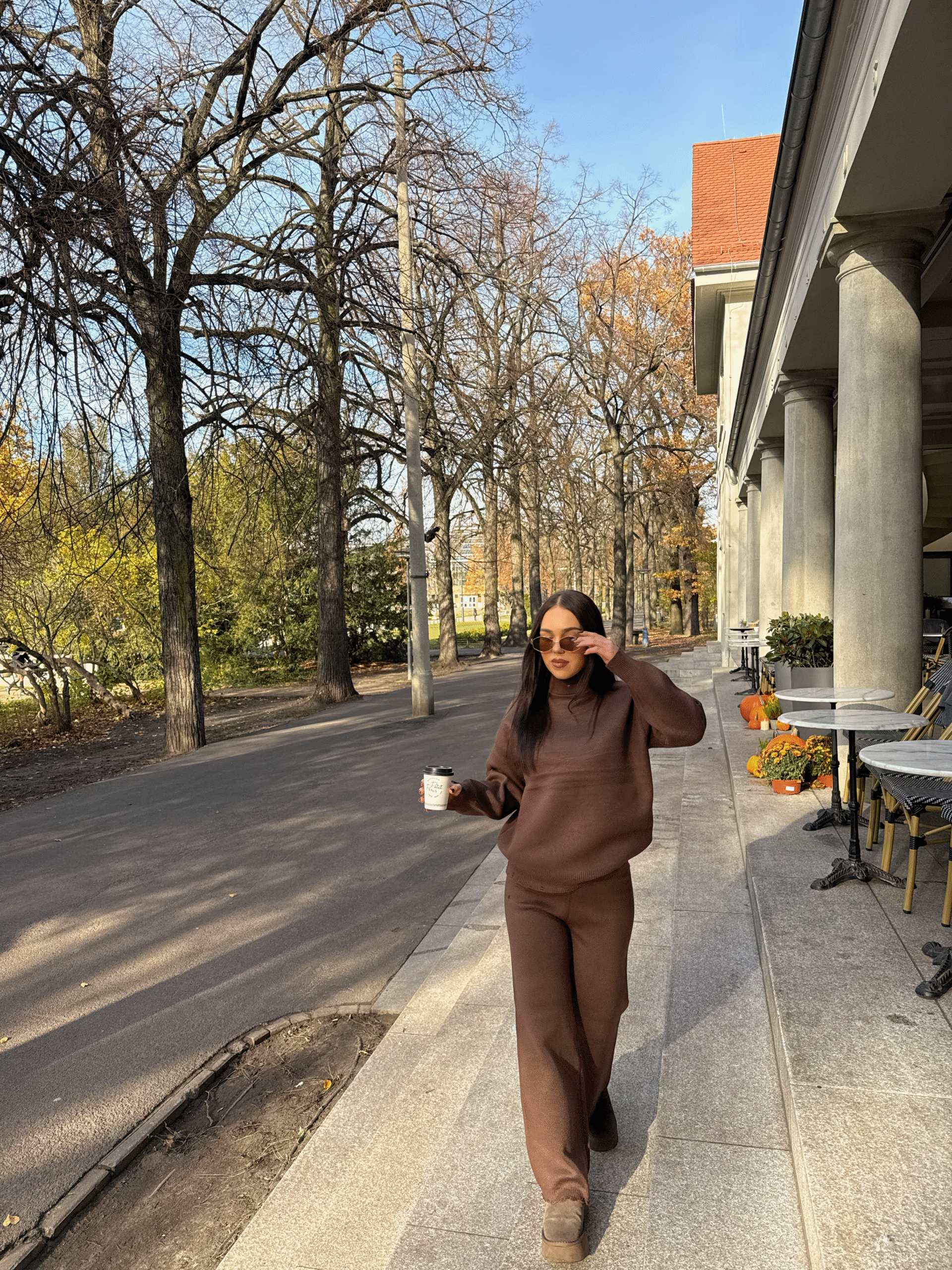Braunes Set aus weichem Stoff mit dezentem, stilvollem Fransenabschluss. Mit Rollkragen und lockerer Passform – perfekt, um sich lässig zu fühlen und trotzdem stilvoll auszusehen. Der lässige, gemütliche Vintage-Look hebt sich von klassischen Trainingsanzügen ab.