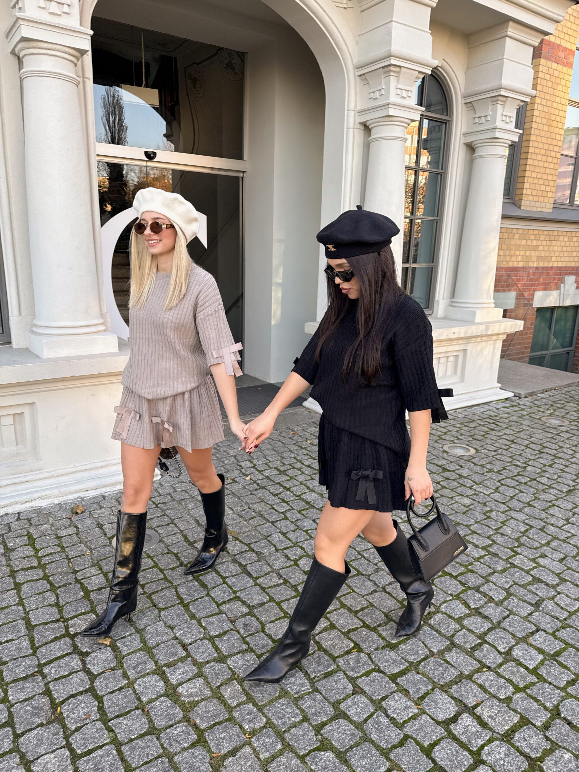 Das klassische Set in Marineblau kombiniert tiefes Marineblau mit zarten, romantischen Details in Form von Schleifen an den Ärmeln. Der kurze Pullover und der Rock in einem eleganten Schnitt ergeben ein Set, das ideal für die Arbeit, Meetings oder stilvolle Ausflüge ist und dabei bequem und schick bleibt.