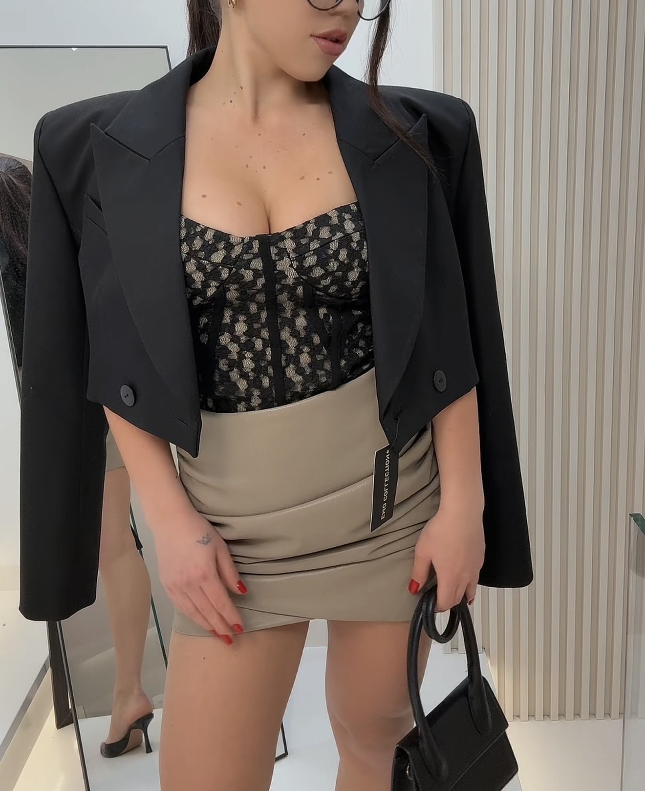 Ein sinnliches Korsett-Top aus schwarzer Spitze mit beiger Unterlegung, die das Design dezent akzentuiert.