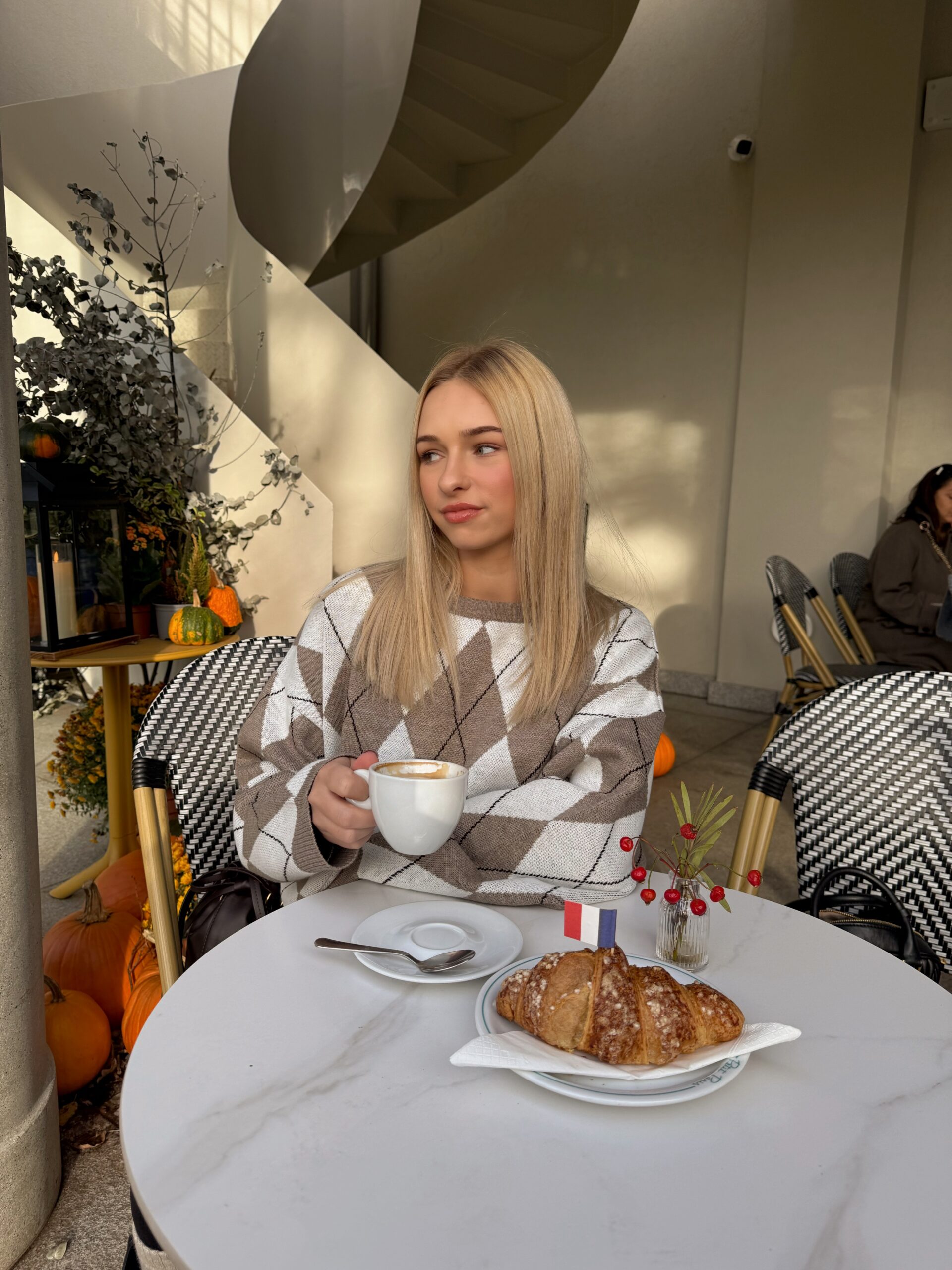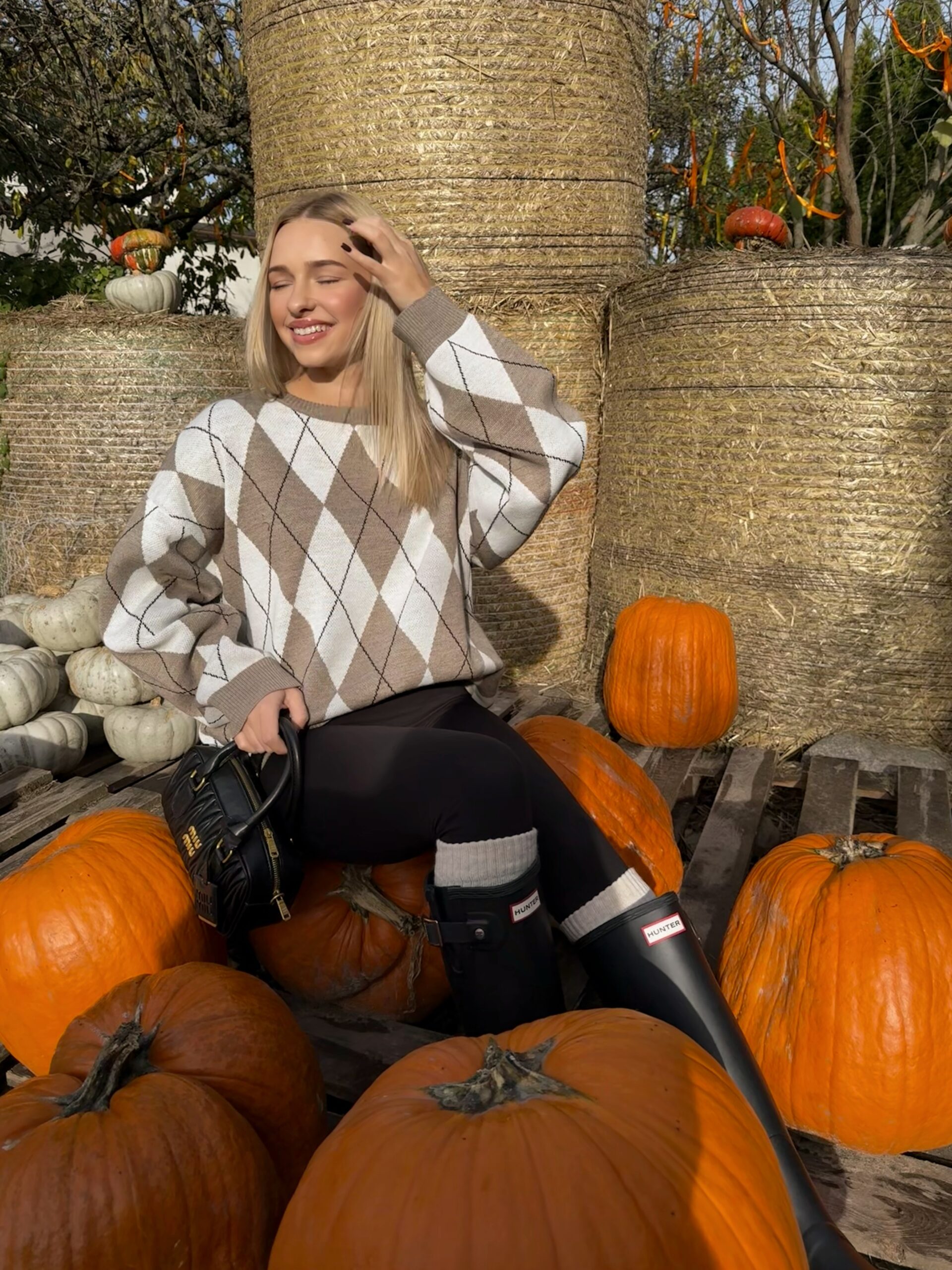 Ein Pullover in klassischem Rautenmuster, der Eleganz mit herbstlicher Wärme verbindet. Der weiche Oversize-Schnitt und die gedeckten Farben Beige, Braun und Weiß machen ihn zu einem Must-Have dieser Saison. Perfekt mit Leggings, Stiefeln und einem heißen Kaffee in der Hand ☕🍁.
