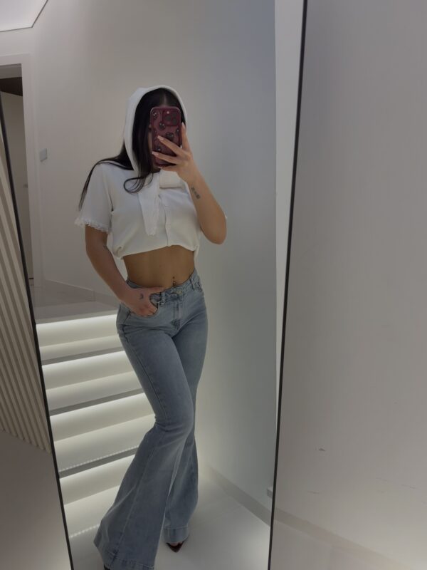 Bright bell-bottom jeans that beautifully shape the figure and optically elongate the legs. Fitted at the hips and thighs, they subtly widen towards the bottom, creating proportions that slenderize the entire figure. The light shade of denim adds lightness to styling and fits perfectly into a fresh everyday look.