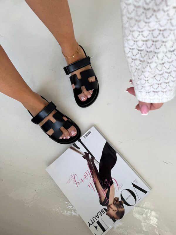 These black flip-flops are a combination of timeless elegance and everyday comfort. The distinctive premium-style straps sit beautifully on the foot, while the adjustable clasp ensures a perfect fit.
