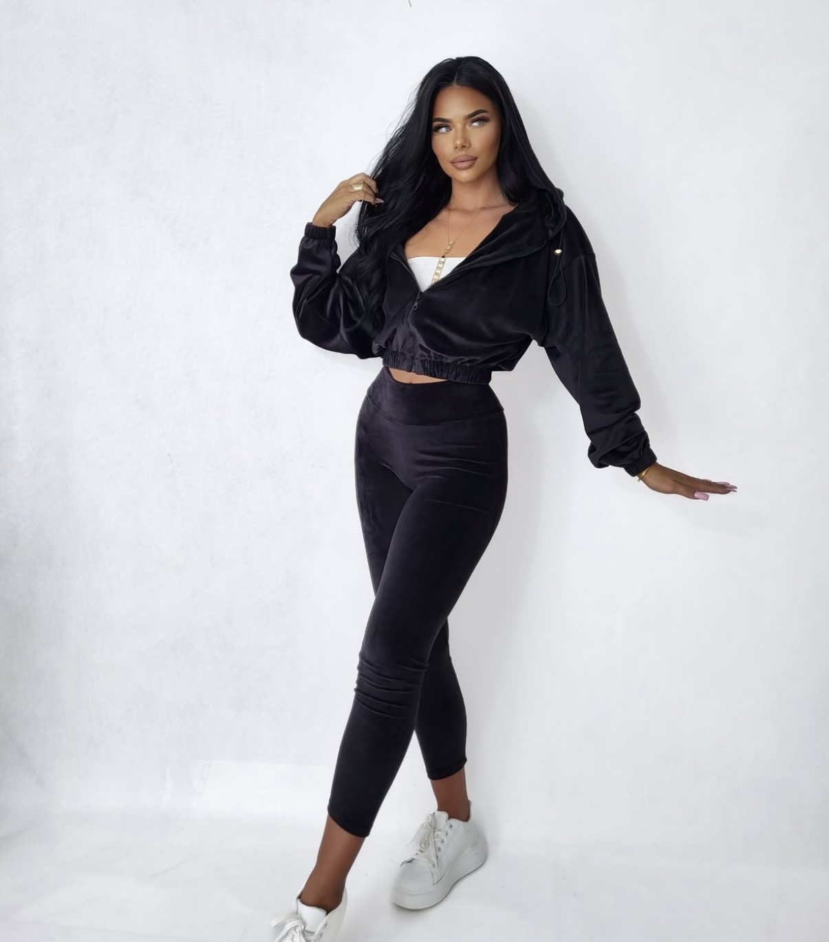 Exceptional women’s set made of soft, pleasant to touch velour. It consists of a short, loose-fit hooded sweatshirt and high-waisted fitted leggings. An ideal choice for everyday wear, as well as for sporty or casual looks. The sweatshirt and leggings together create a stylish set that perfectly accentuates your figure and provides full comfort. Complete the look with your favorite sneakers and feel comfortable in any situation!