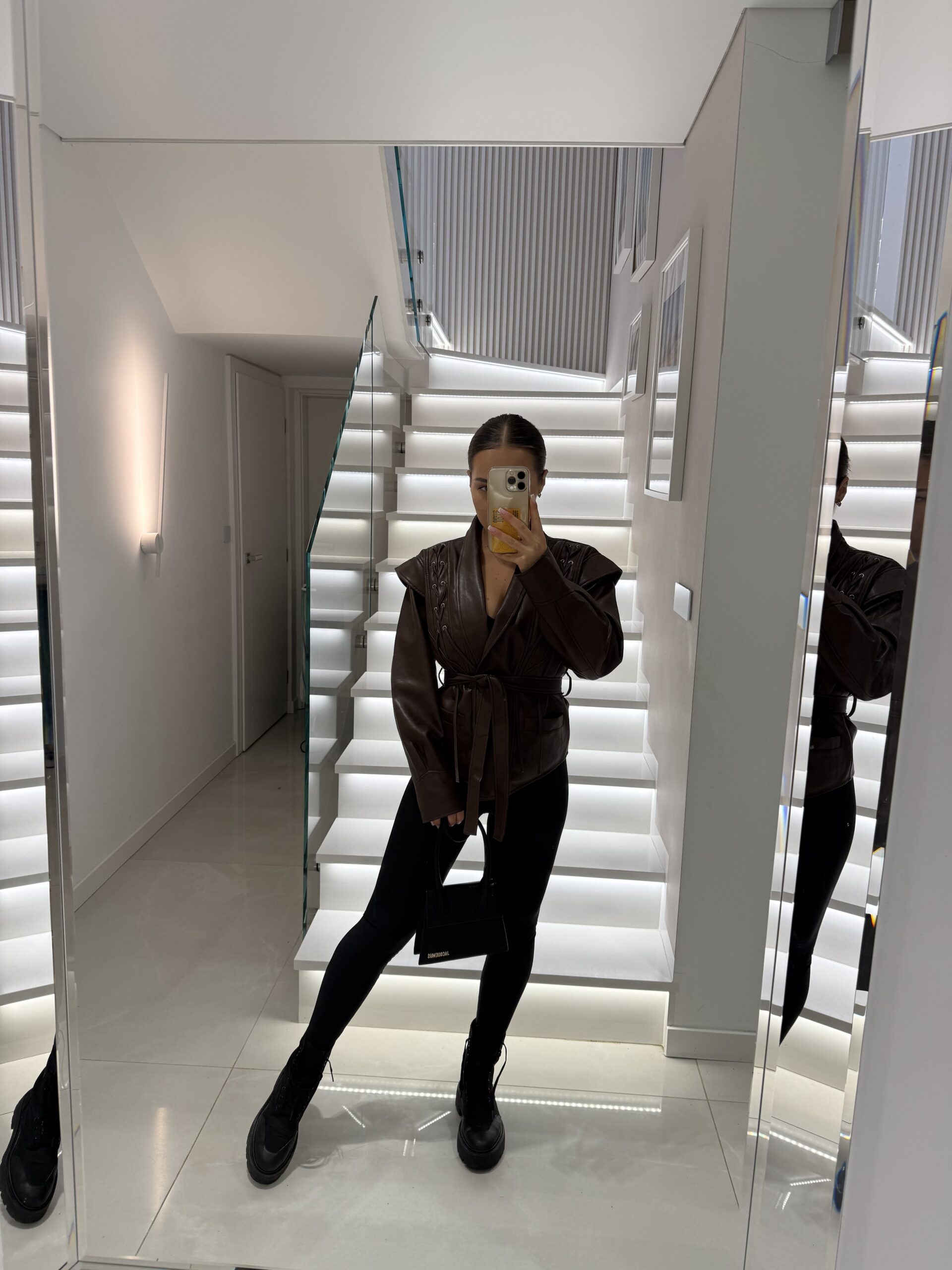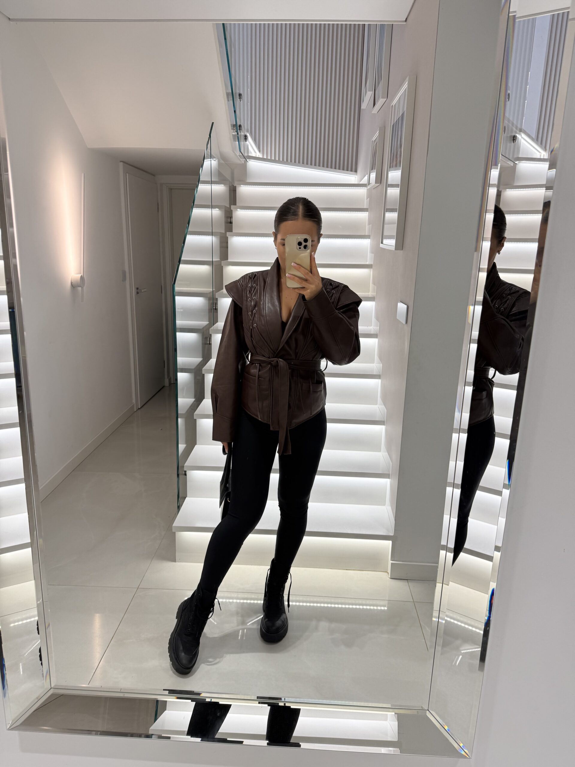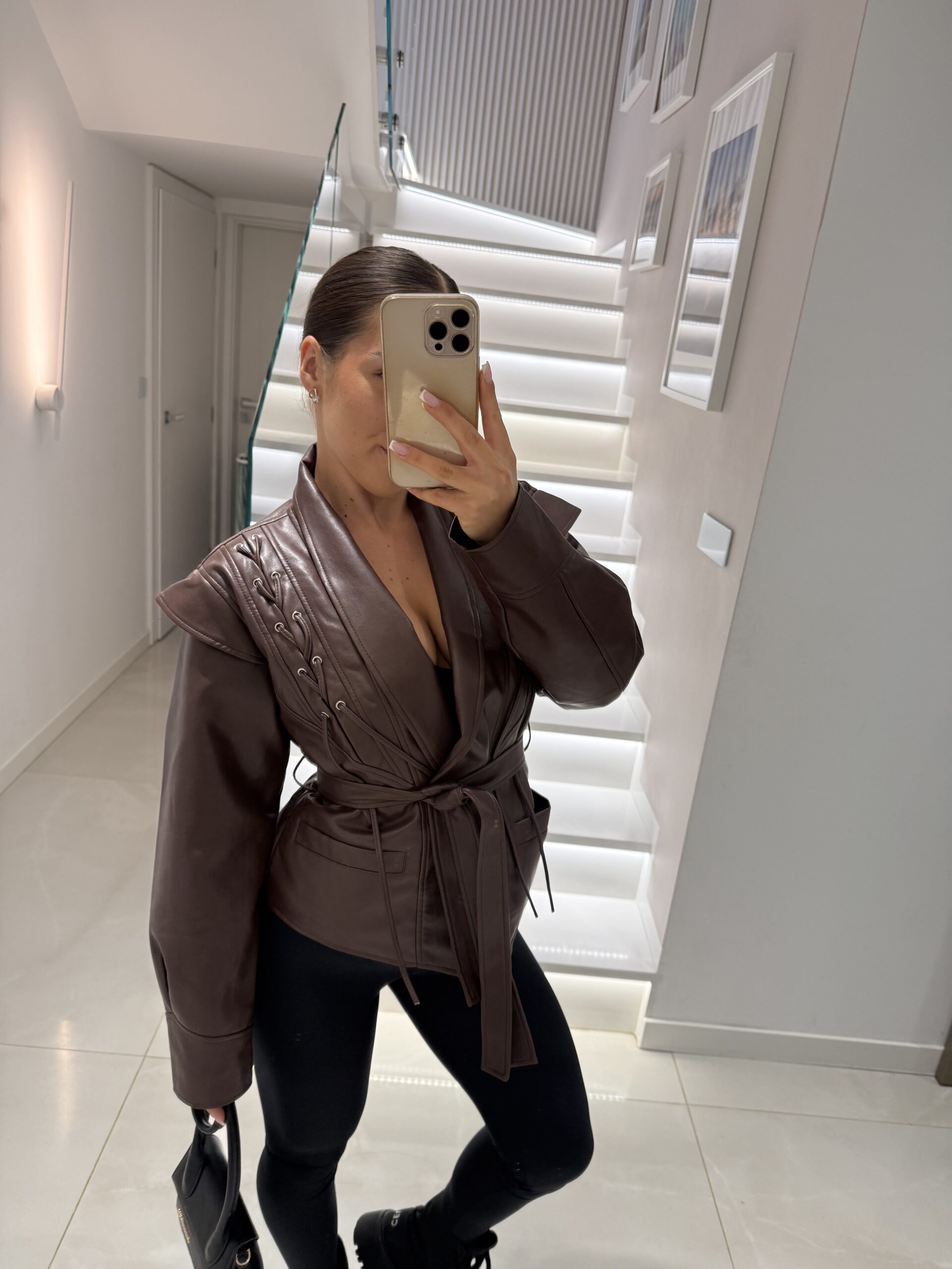 This dark chocolate leather jacket combines elegance with a powerful edge. A waist tie beautifully sculpts the silhouette, while decorative stitching and shoulder ties add a modern, designer touch. Perfect for everyday looks with leggings and ankle boots, or for an evening out.