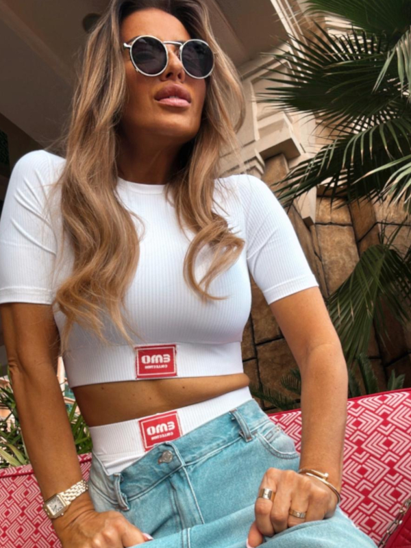 Delicate, modern and extremely feminine. The white striped knit set consists of a matching short-sleeved blouse and a thong with a distinctive red Emo brand label. The pleasant-to-touch fabric accentuates the silhouette and ensures comfortable wearing.