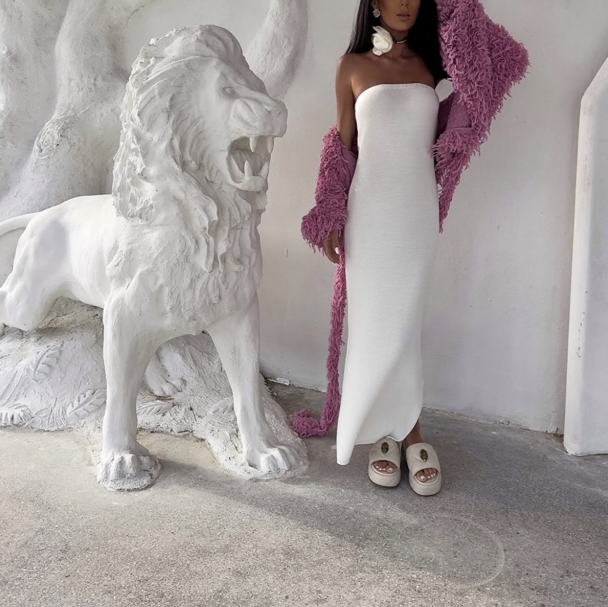 A fitted maxi dress made of thin knit fabric in pure white. This strapless design beautifully hugs the body, subtly sheer, perfect for summer or as a swimsuit cover-up. It gently accentuates the silhouette and enhances a tan. The look is completed by a striking accessory – a textile rose on the wrist, adding a feminine, romantic touch. Overall, it creates a light, sensual look with a hint of elegance.
