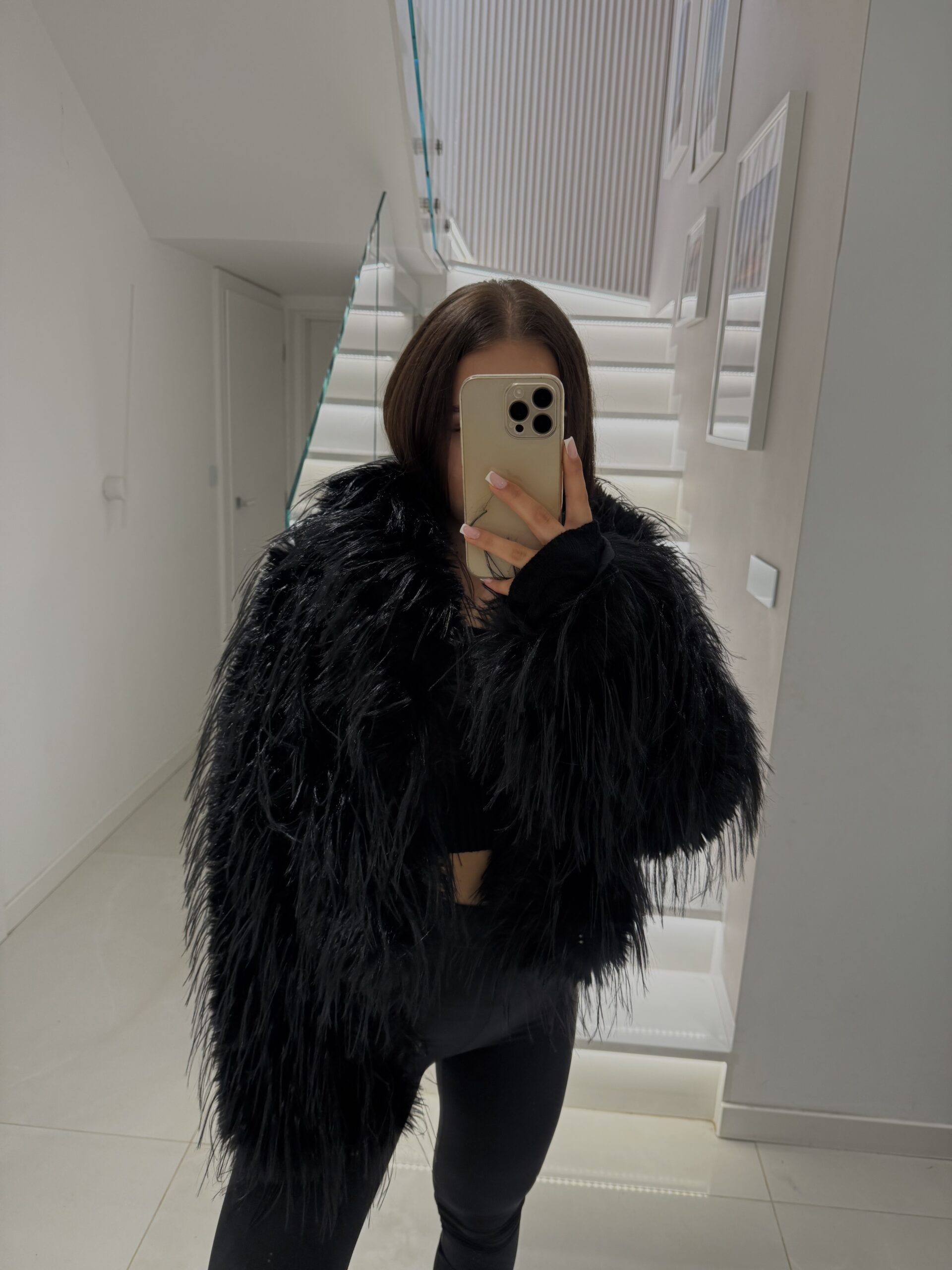 A classic black fur coat with a fluffy texture that adds character to any outfit. Perfect for cooler days – it combines comfort with a striking appearance. Suitable for both everyday outfits and special occasions. This model is for women who value timeless elegance with a touch of boldness