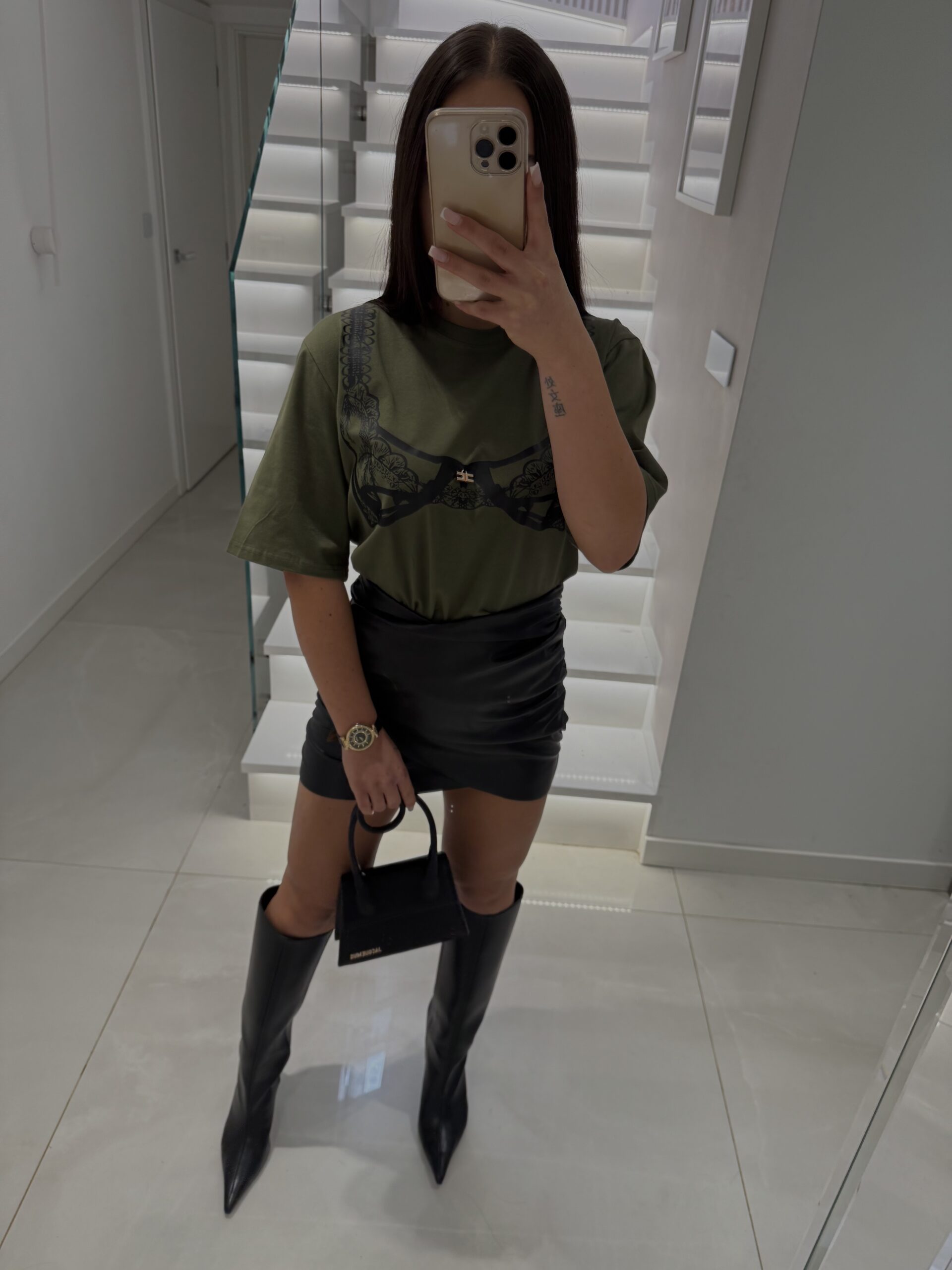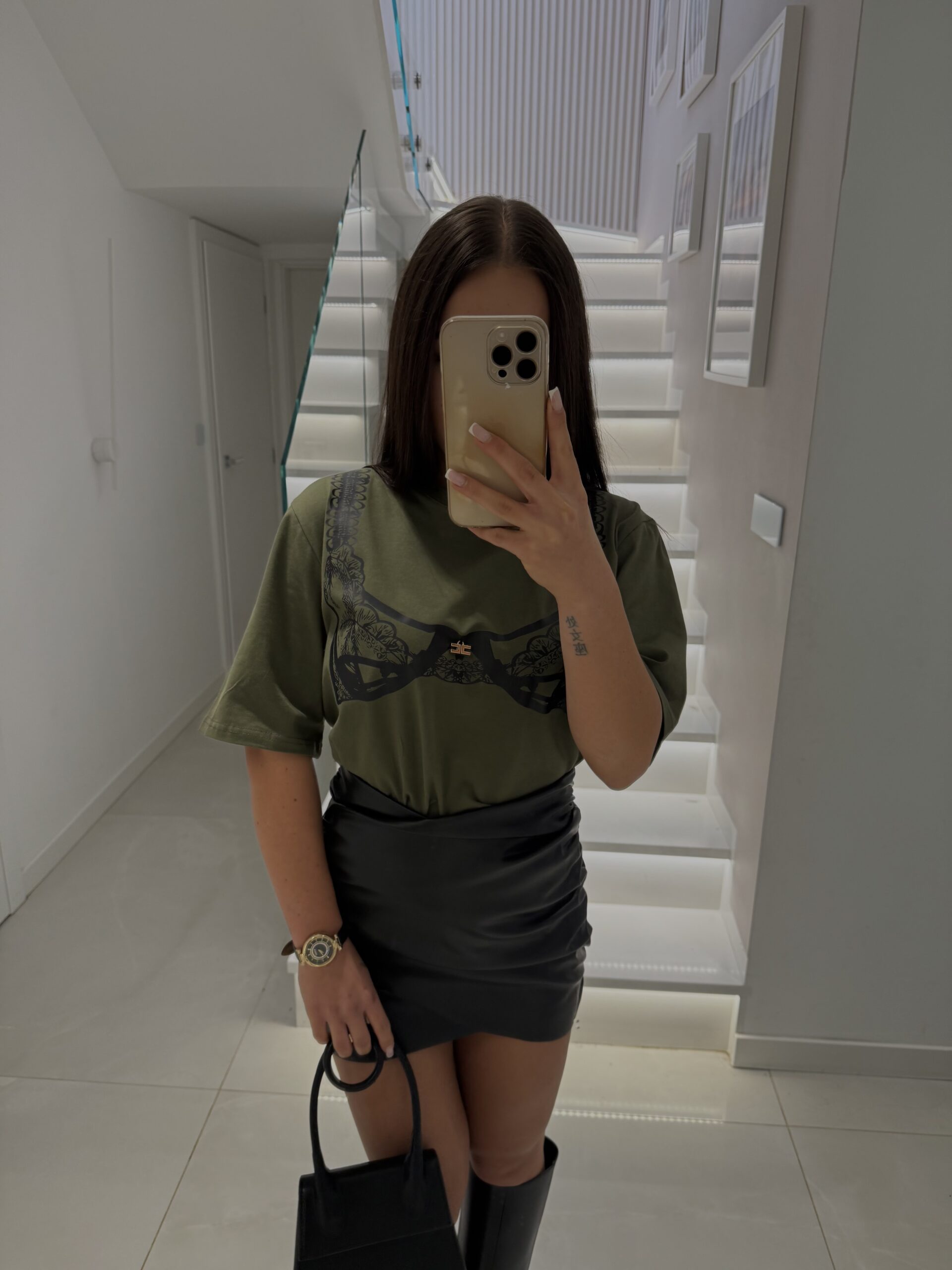 An oversized khaki t-shirt featuring an original bra print design – a playful yet sensual accent. Perfectly breaks up the classic look and pairs beautifully with a ruched leather skirt. 100% cotton.