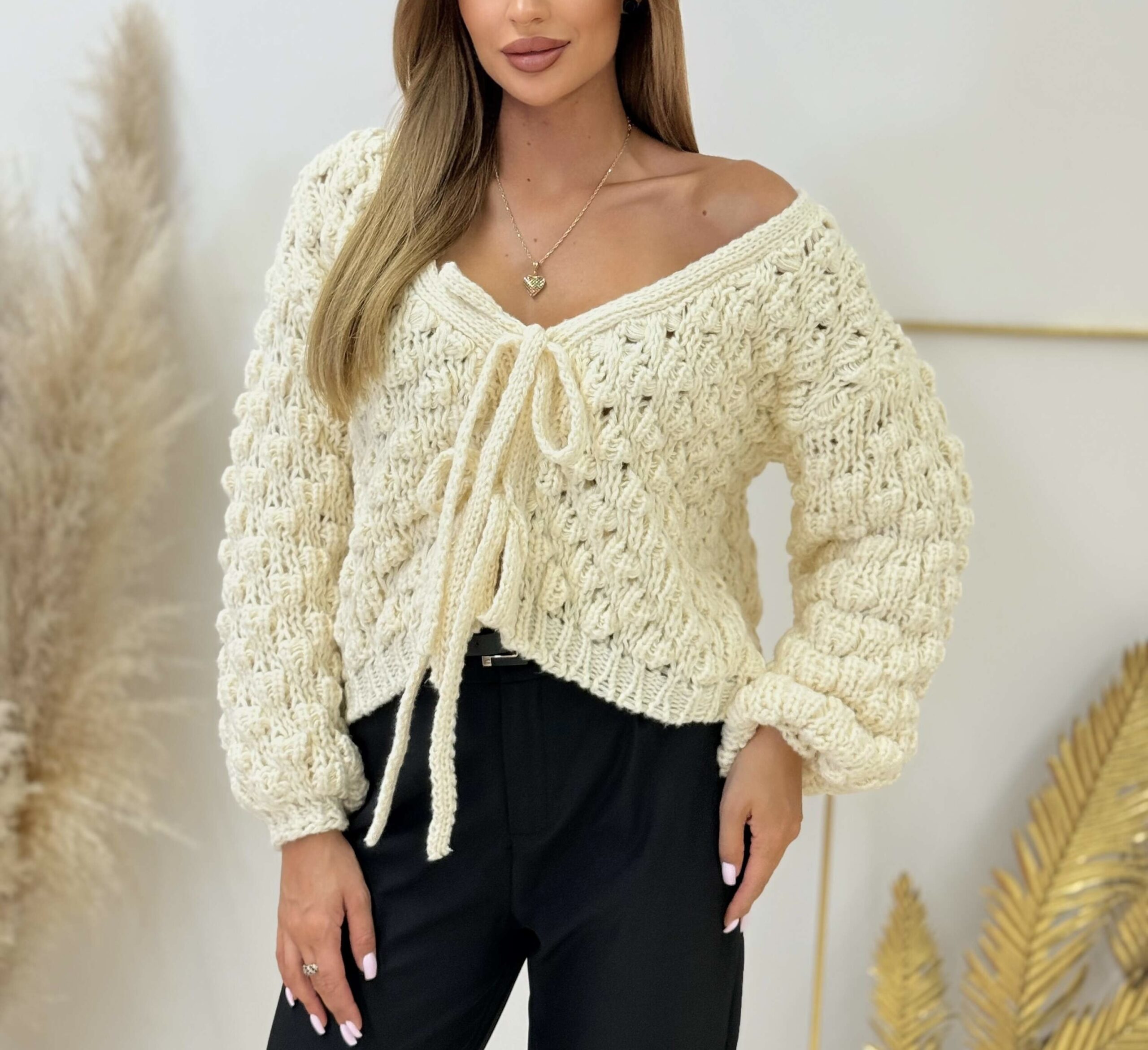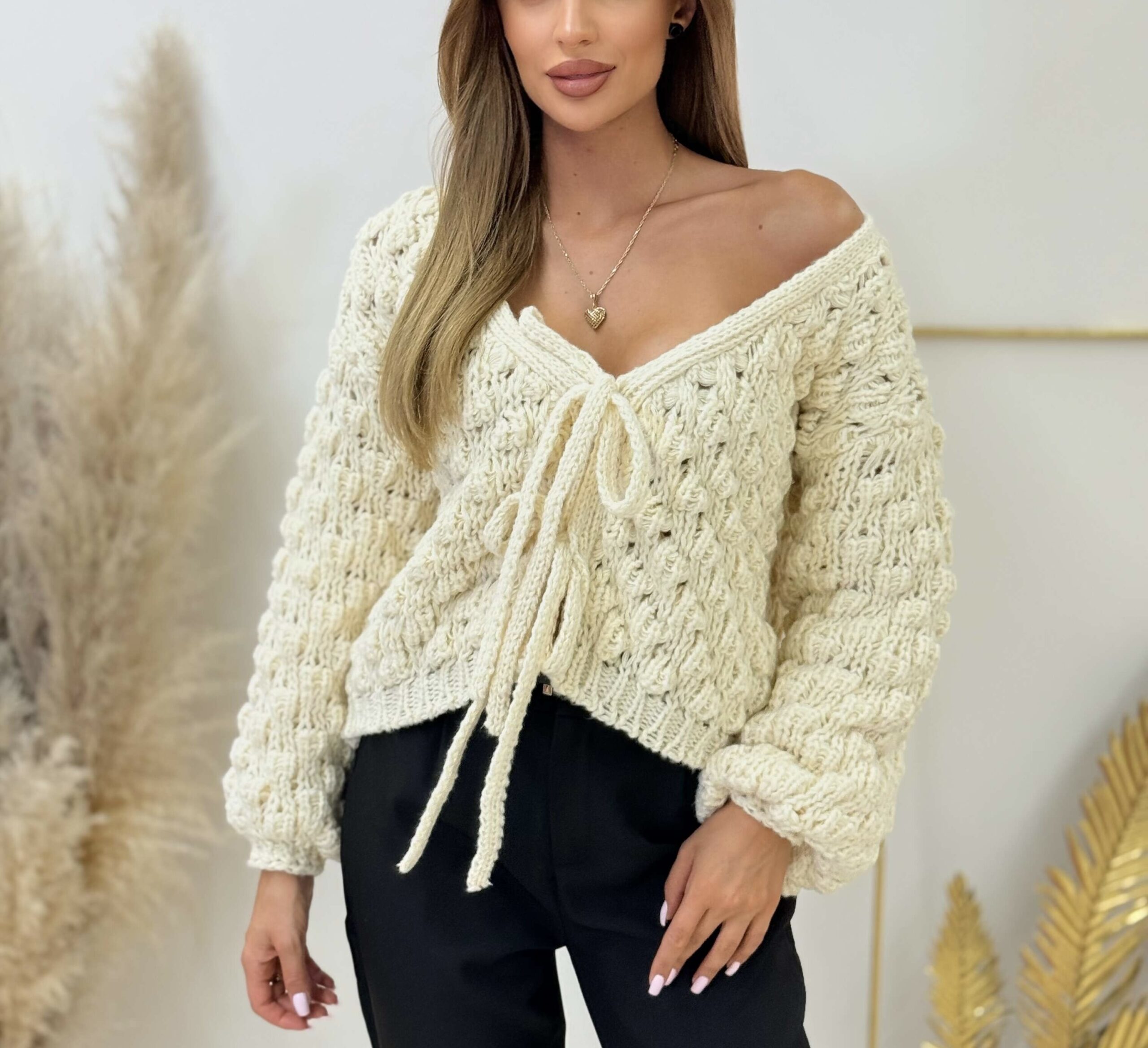 Soft, cozy, and feminine – the Luna sweater is the essence of autumn comfort. Crafted from a thick, uniquely textured knit, it drapes beautifully on the figure and adds a cozy touch to any outfit. The front tie accentuates the waist and allows you to adjust the fit. Perfect with jeans, cigarette pants, or midi skirts – for everyday wear and cooler evenings.