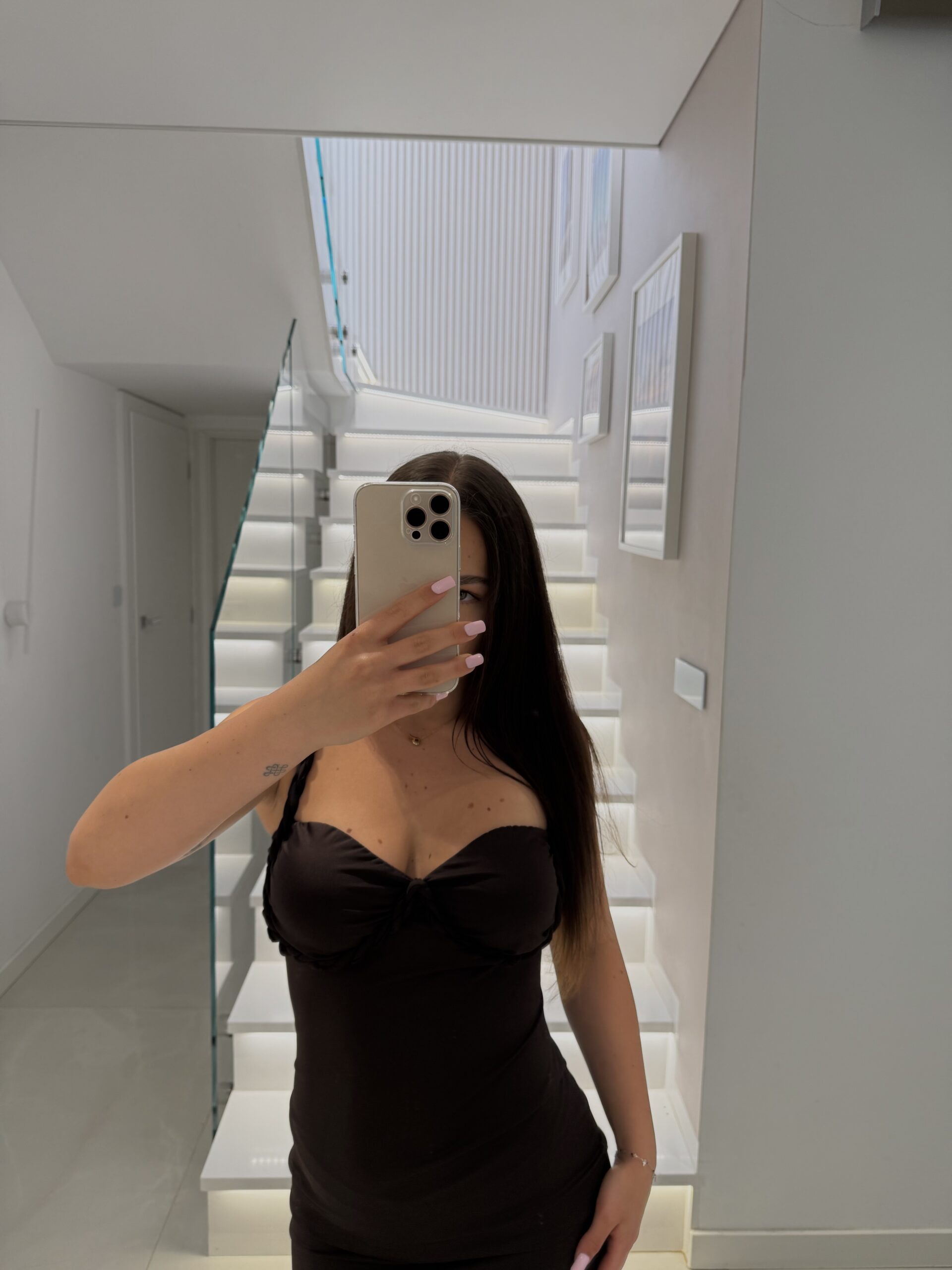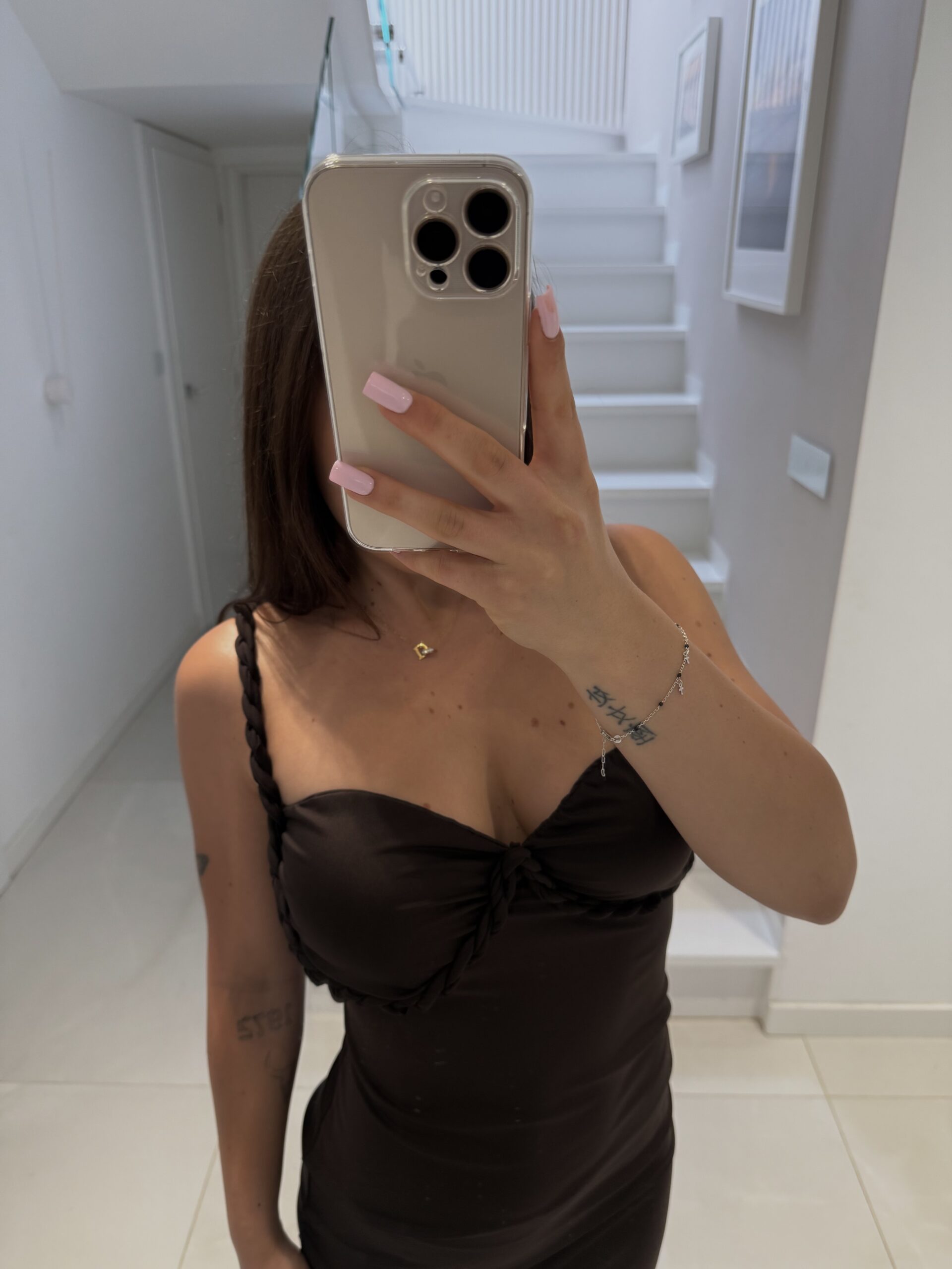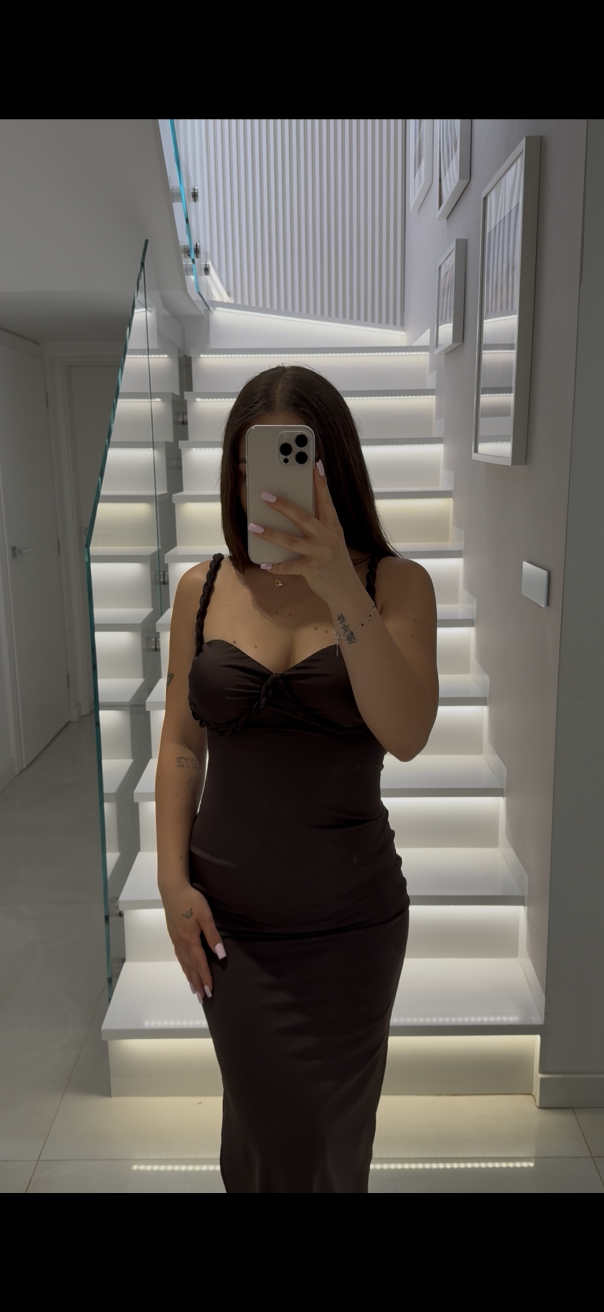 A midi-length dress in deep chocolate shade, with a softly gathered neckline and braided straps. The fitted cut accentuates the silhouette while remaining comfortable and stretchy.