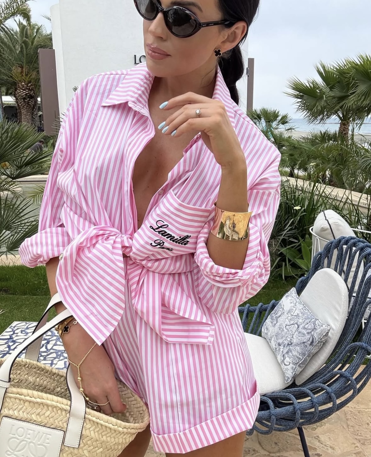 Stop time in the most charming way. This pink and white set combines girlish lightness with stylish nonchalance. The shirt with Lamilla Paris embroidery adds character, while the shorts beautifully accentuate the waist. Perfect for sunny mornings and peaceful evenings.