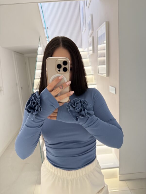 Phenomenal blouse in the shade of stormy blue , which attracts the eyes with subtle, romantic details. Fitted cut beautifully emphasizes the silhouette, and striking frills at the cuffs add to the whole girlish charm and elegance. The soft, stretchy material ensures comfortable all-day wear.
