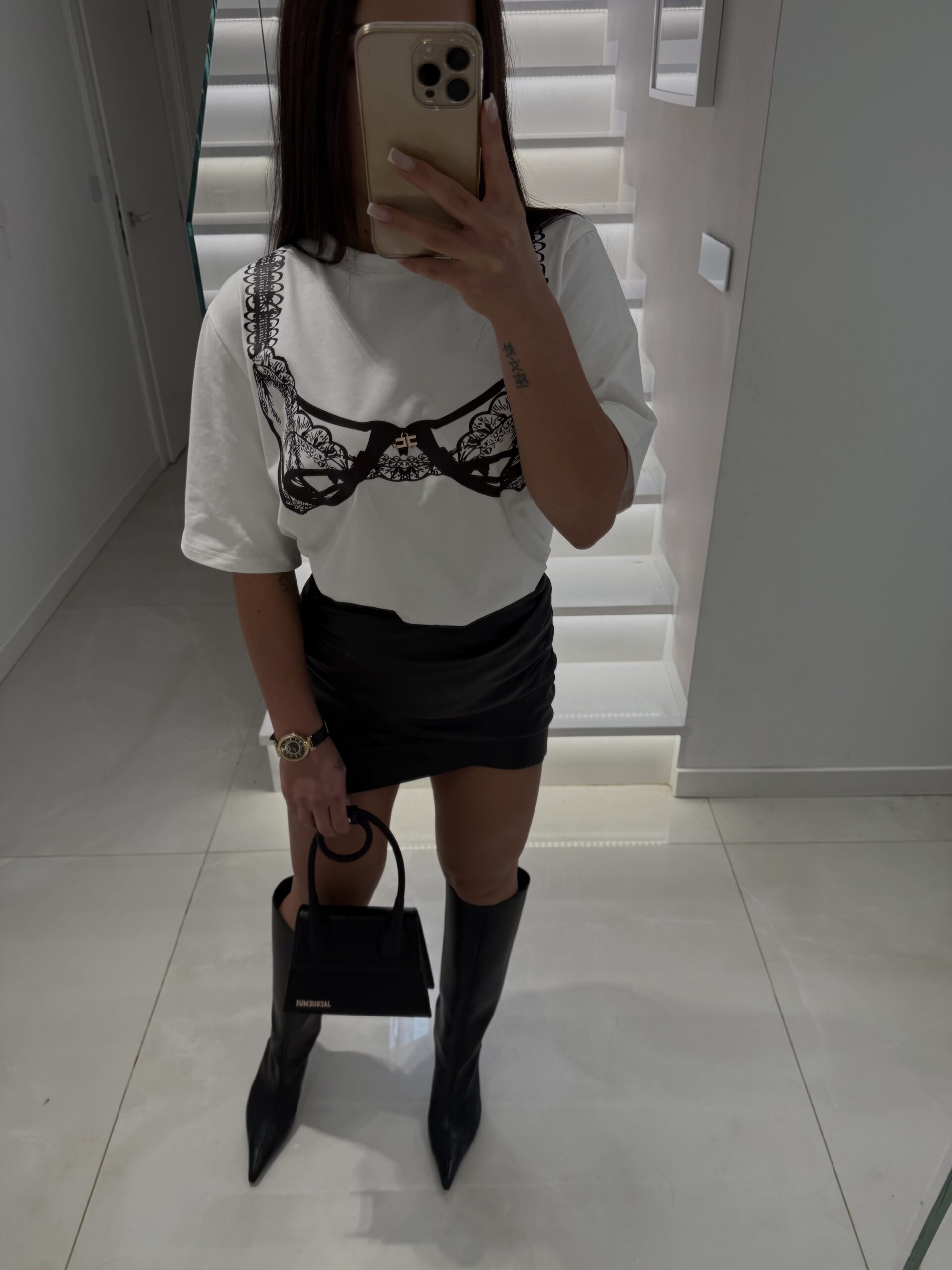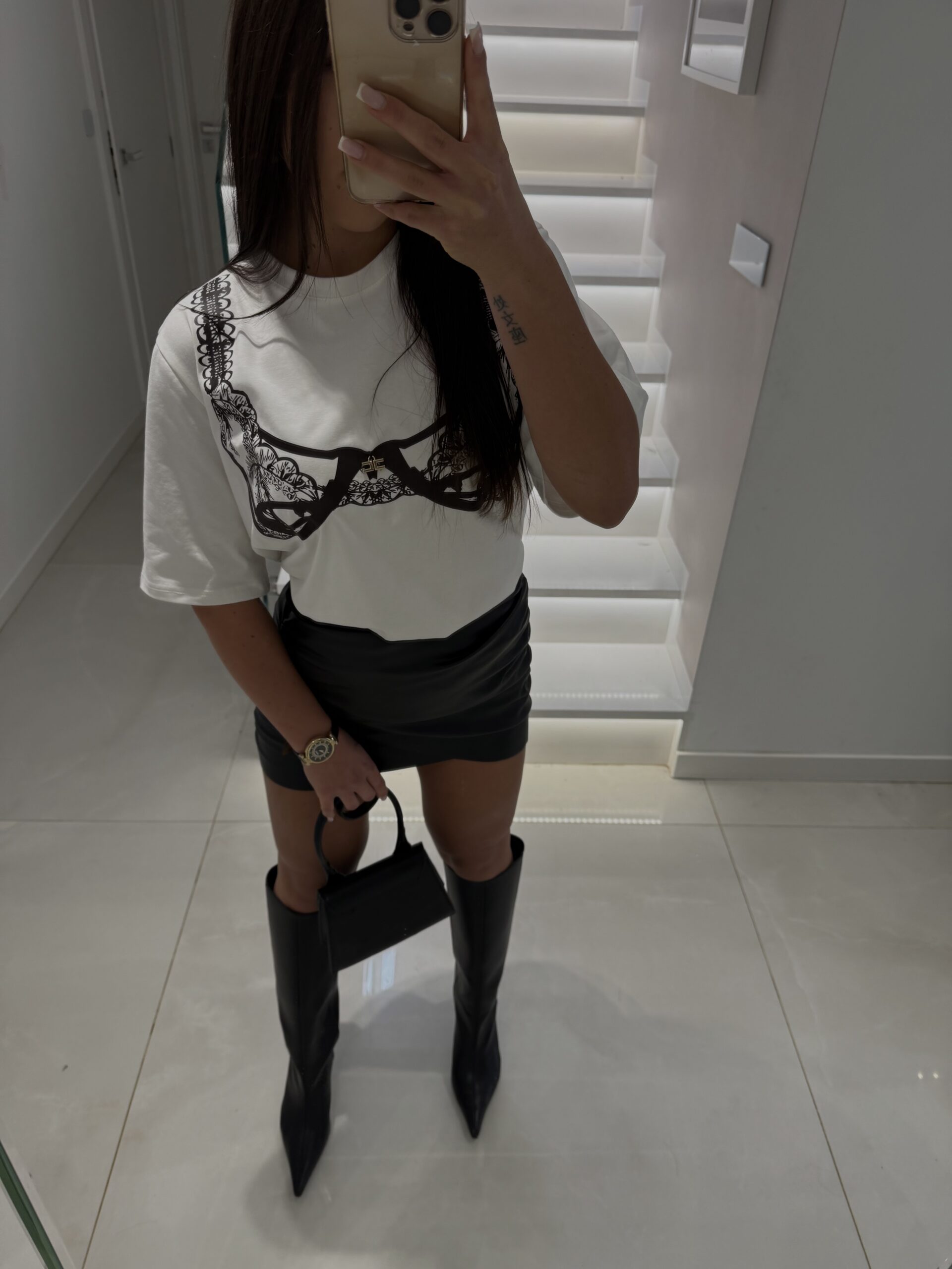 White oversized t-shirt with bra print – a light and fashionable twist that will add character to any outfit. Combines girly casual with fashion edge. 100% Cotton