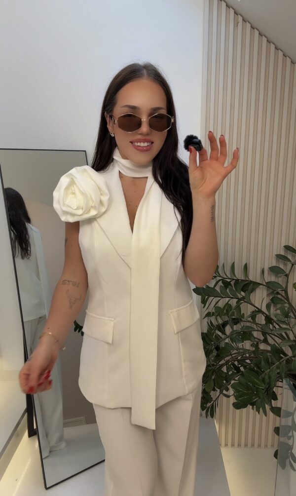 Elegancki, nowoczesny garnitur w odcieniu czystej bieli, zaprojektowany z myślą o kobiecie, która ceni detale i wielofunkcyjność. To komplet, który wyróżnia się dopracowaną formą oraz możliwością stylizacji na wiele sposobów.