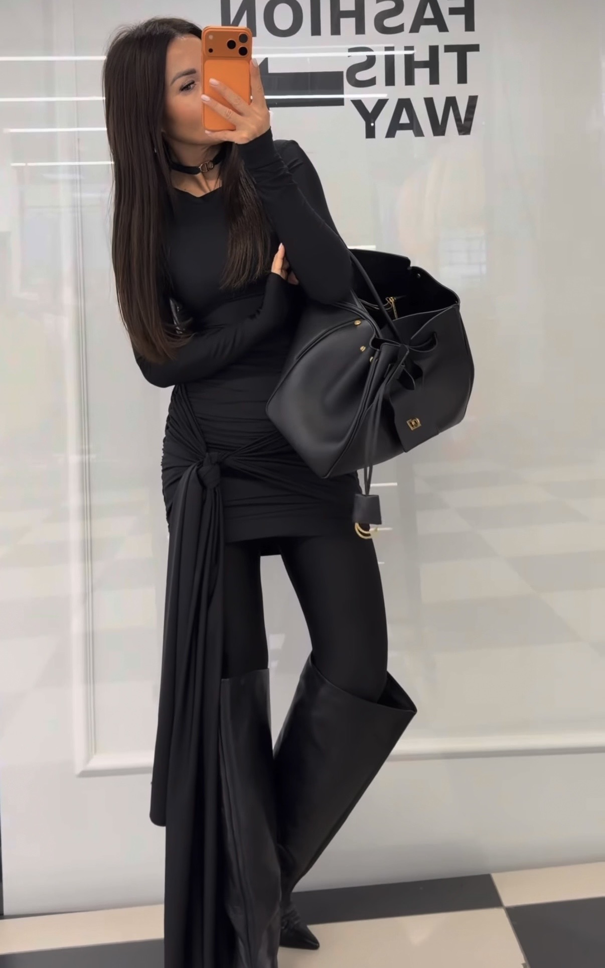 Ten czarny komplet to połączenie dopasowanej bluzki oraz efektownej spódnicy z dekoracyjnym wiązaniem, które pięknie modeluje sylwetkę.