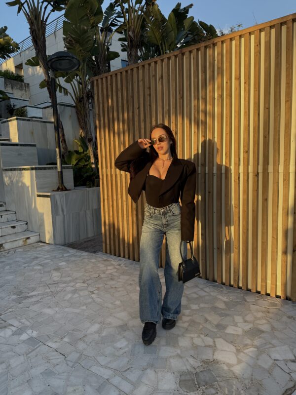 Czarne body typu ‘druga skóra’ z cienkimi ramiączkami, które perfekcyjnie dopasowuje się do sylwetki. Model subtelnie podkreśla dekolt i delikatnie unosi biust, gwarantując zmysłowy i elegancki efekt. Idealne do codziennych stylizacji pod marynarkę, jak i na wieczorne wyjścia.