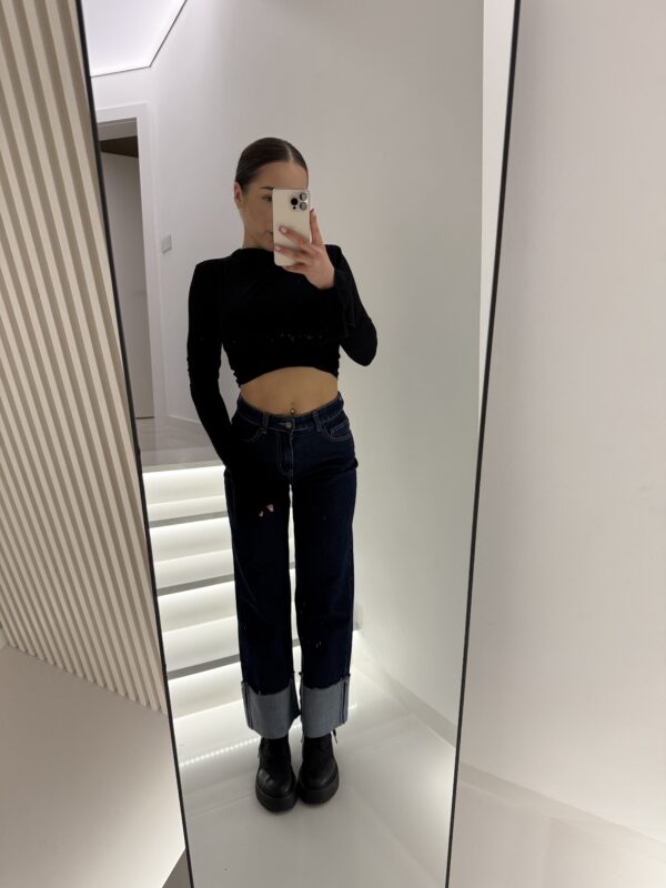 Proste jeansy z charakterystycznie podwiniętą, szerszą nogawką. Klasyczny krój i podwinięcie przy dole dodają im nowoczesnego, lekko nonszalanckiego stylu. Sprawdzą się w codziennych stylizacjach — świetnie wyglądają zarówno z t-shirtem, jak i swetrem czy krótką kurtką.