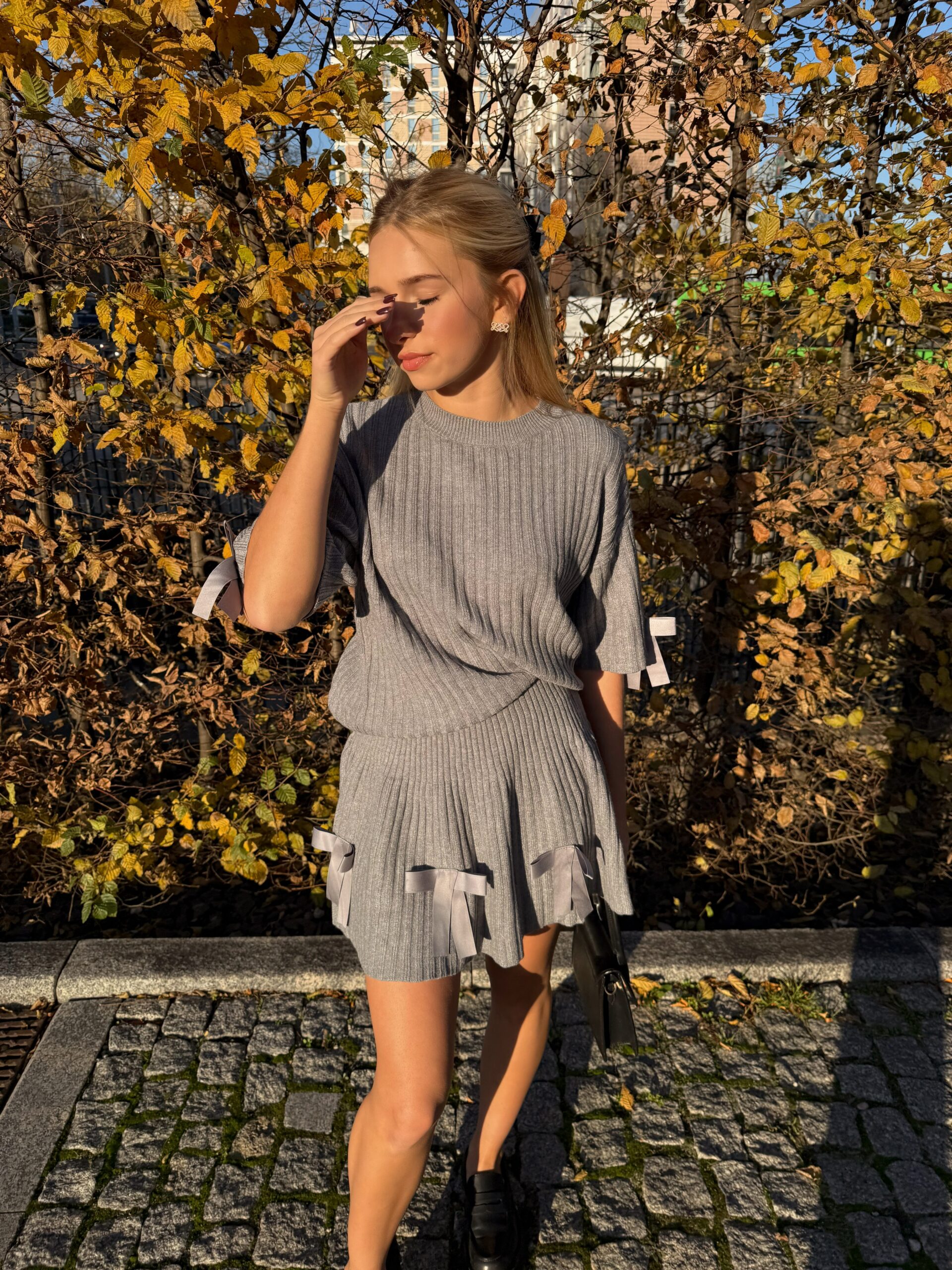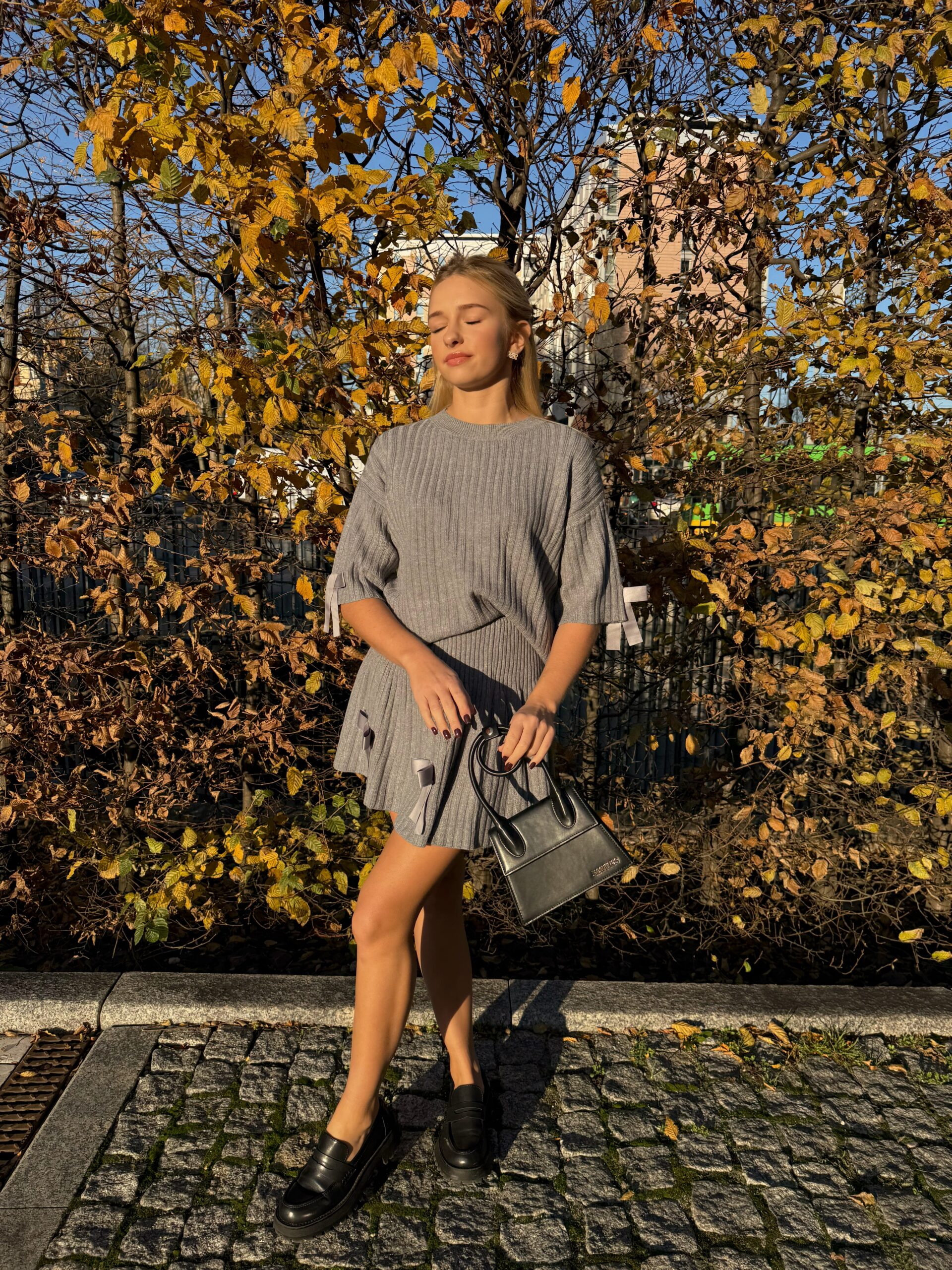Dzianinowy komplet w odcieniu chłodnej szarości, który zachwyca prostotą i harmonią. Idealny na jesienne dni, gdy chcesz czuć się swobodnie, ale nadal stylowo. Minimalizm, który przyciąga uwagę subtelnością.🩶