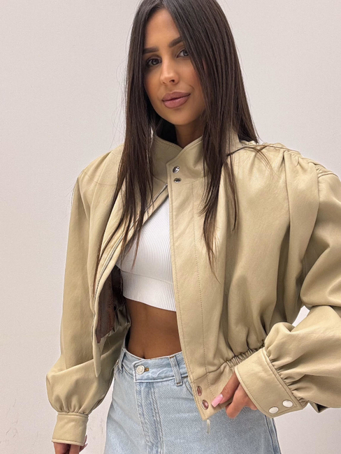 Kremowa kurtka skórzana ze stójką, wykonana z miękkiej eko-skóry. Delikatne marszczenia nadają jej lekko „bombkowy” fason, który pięknie układa się na sylwetce. Zapinana, wygodna i ponadczasowa — idealna baza do codziennych i eleganckich stylizacji.