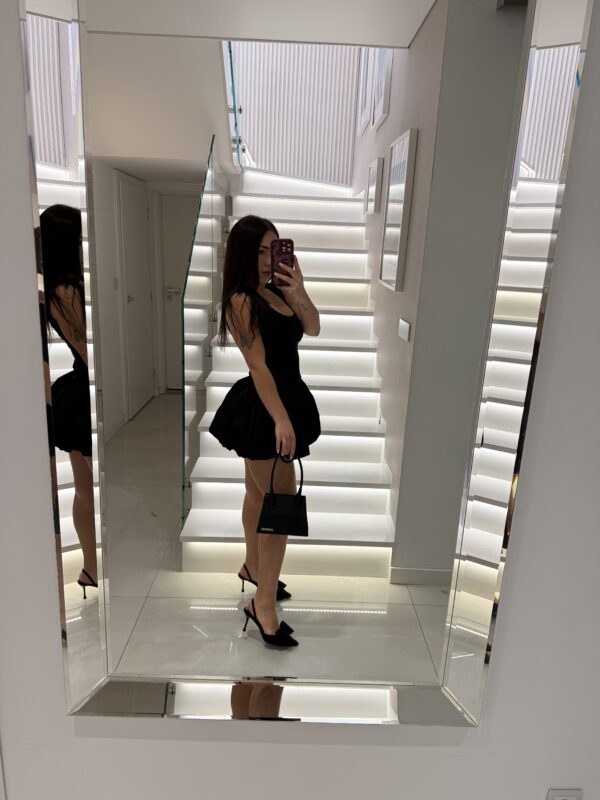 Czarna sukienka o kroju bombki, krótka i perfekcyjnie gładka — minimalistyczna forma, która robi cały efekt. Delikatnie podkreśla talię i miękko układa się na sylwetce, tworząc lekko rzeźbiarski kształt. Elegancka, ale z charakterem — wygląda świetnie solo, a z mocniejszymi dodatkami zmienia się w wieczorowy statement.