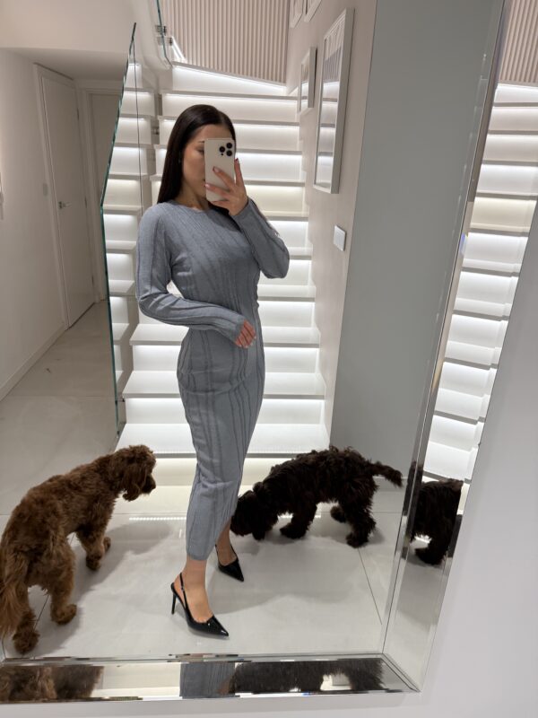 Szara wersja sukienki maxi zachwyca minimalizmem i jakością wykończenia. Przeszycia modelujące, długi rękaw i materiał, który doskonale się układa, tworzą elegancki, spokojny look.