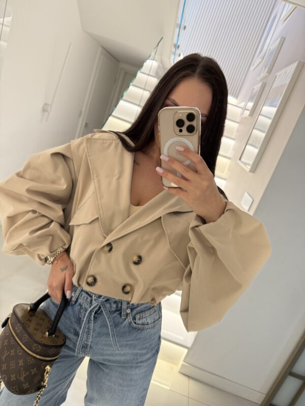 Ten beżowy trencz to idealne połączenie klasyki i nowoczesnej formy. Luźny, oversize’owy krój w zestawieniu z wyrazistymi, bufiastymi rękawami tworzy niezwykle stylową sylwetkę, która przyciąga spojrzenia.